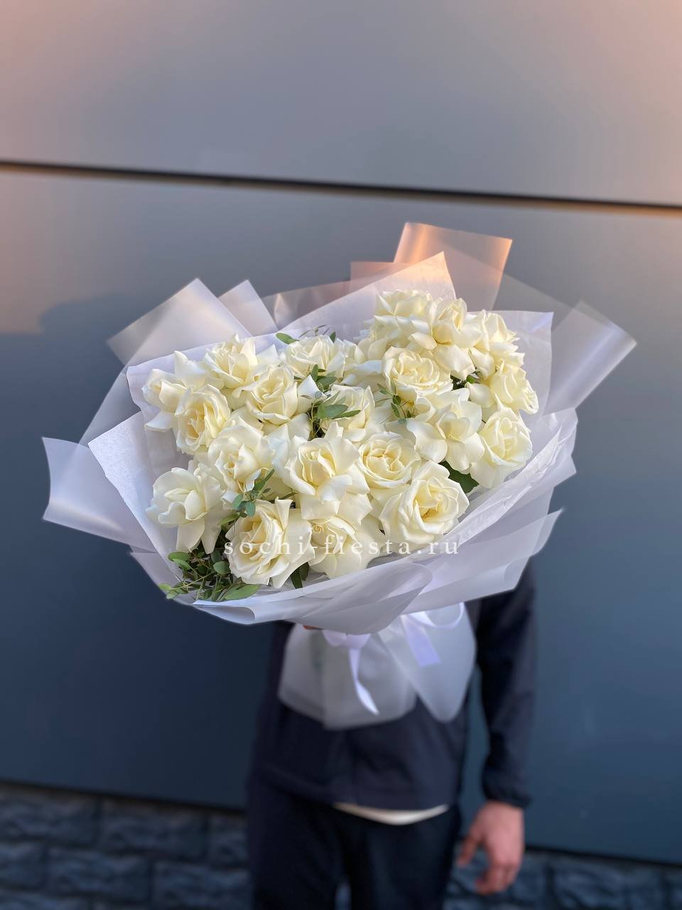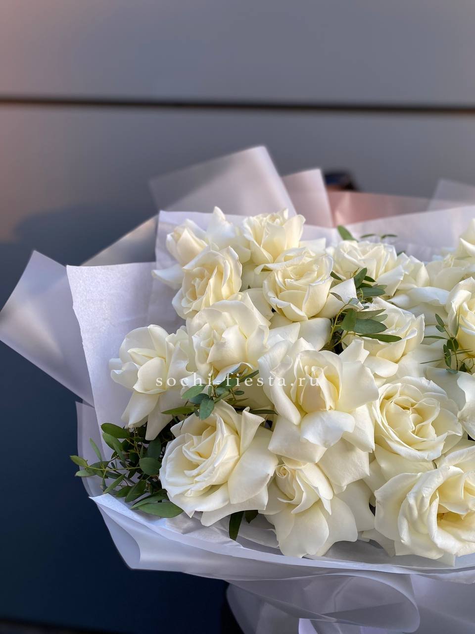 Сто один белый бутон образует впечатляющую композицию с выразительным силуэтом. Монохромное решение подчёркивает архитектуру букета и его визуальное присутствие в пространстве.