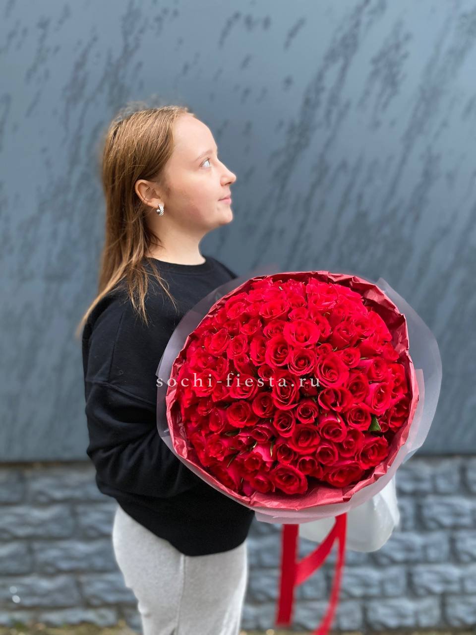Сто один бутон образует плотную красную сферу с безупречной геометрией. Кенийская роза отличается густотой лепестков и насыщенным оттенком который не теряет глубину даже при ярком свете. Букет держит форму и впечатляет масштабом.