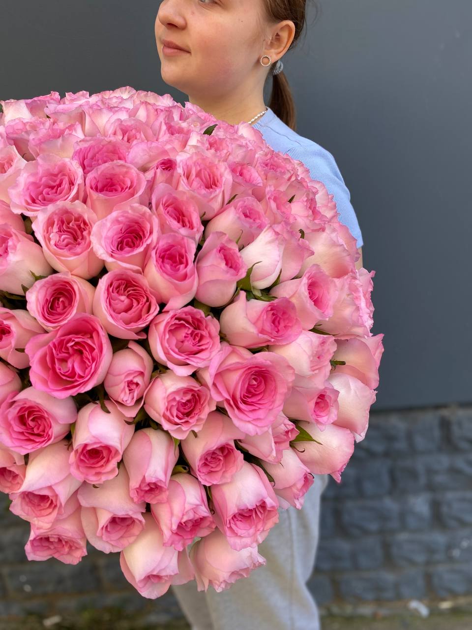 Сто один бутон кенийского пионовидного сорта собраны в масштабную композицию. Белая окантовка лепестков переходит в розовый центр. Впечатляющее присутствие в любом пространстве.