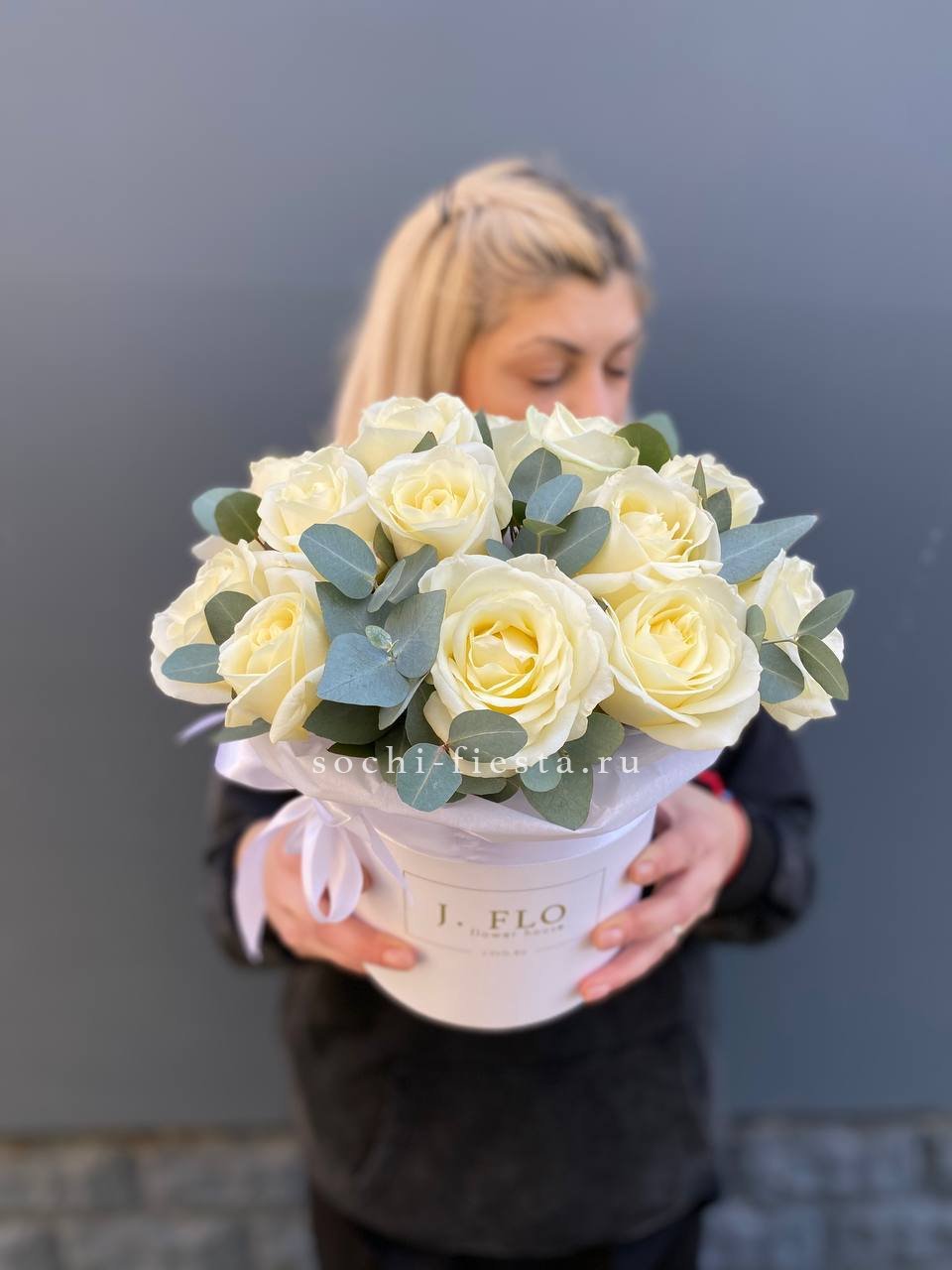 белые розы с эвкалиптом в боксе 16.