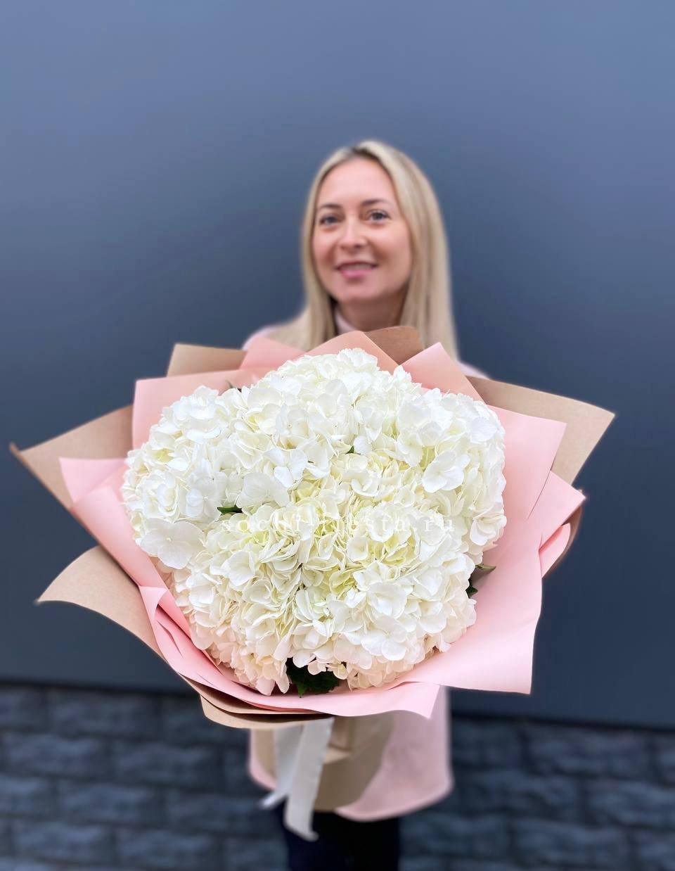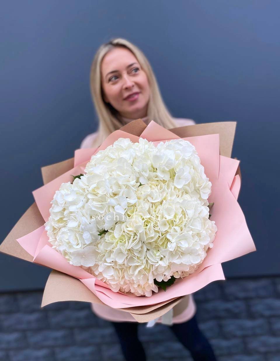 Пять крупных соцветий гортензии в бело-розовой гамме образуют воздушную композицию с переливами света на лепестках. Букет выглядит объёмно и свежо, наполняя пространство мягким цветом.