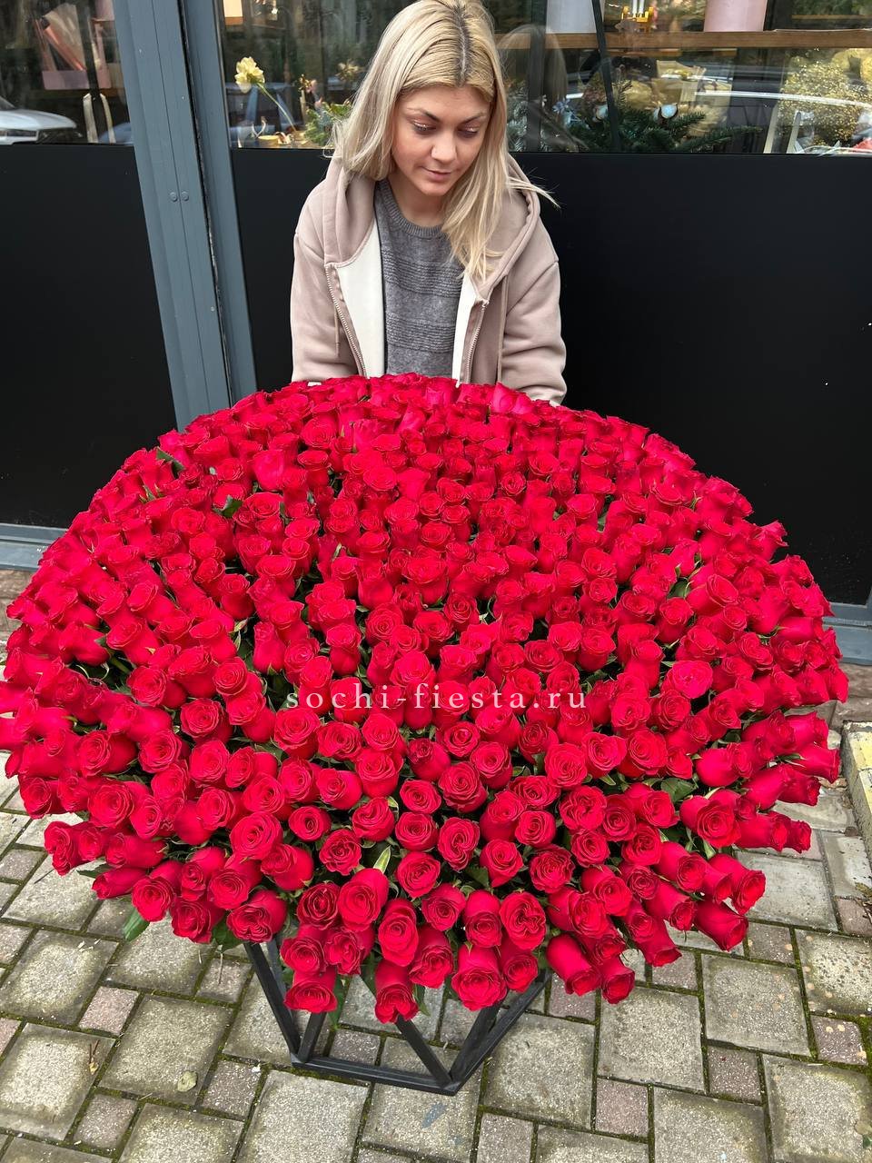 Французские розы глубокого красного оттенка образуют плотное цветочное полотно в корзине. Пятьсот один бутон создает монументальную композицию, где каждый цветок усиливает общее впечатление.