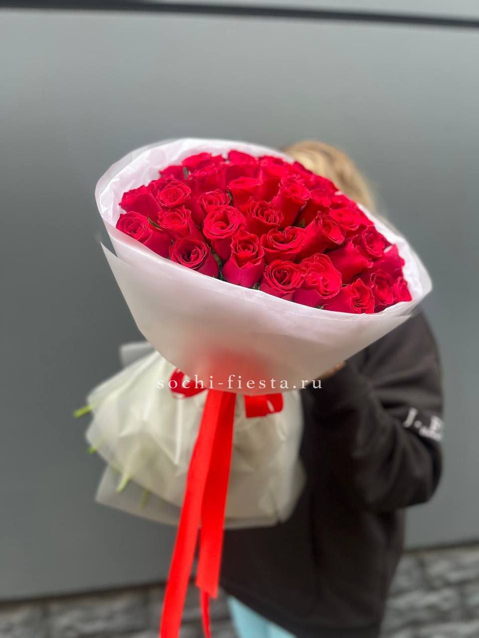 55 красных роз, лента, упаковка.