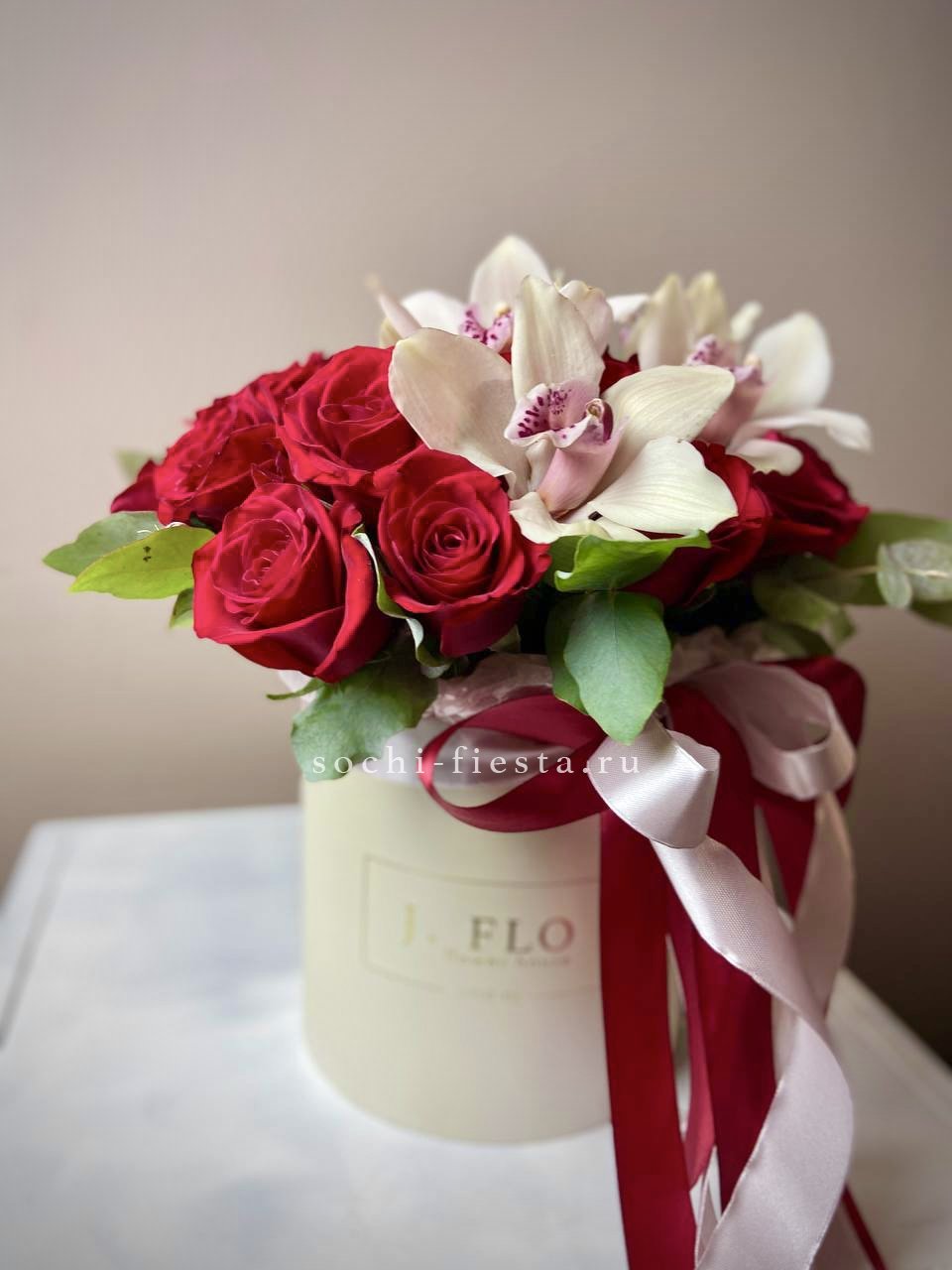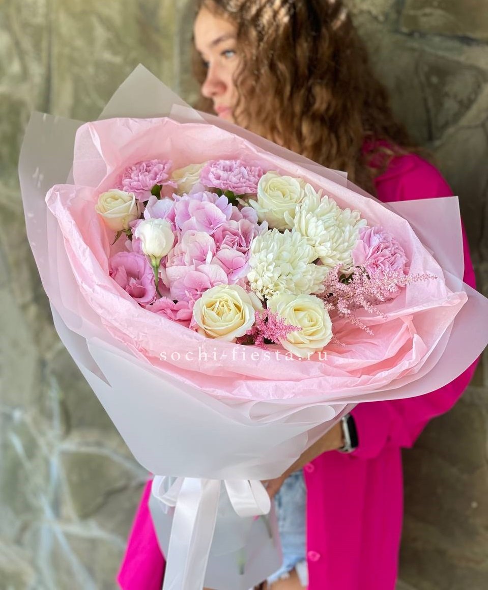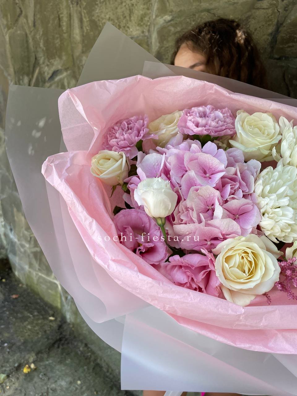 гортензия, вывернутые розы, диантус, кустовая роза, диантусы, оформление в боксе.