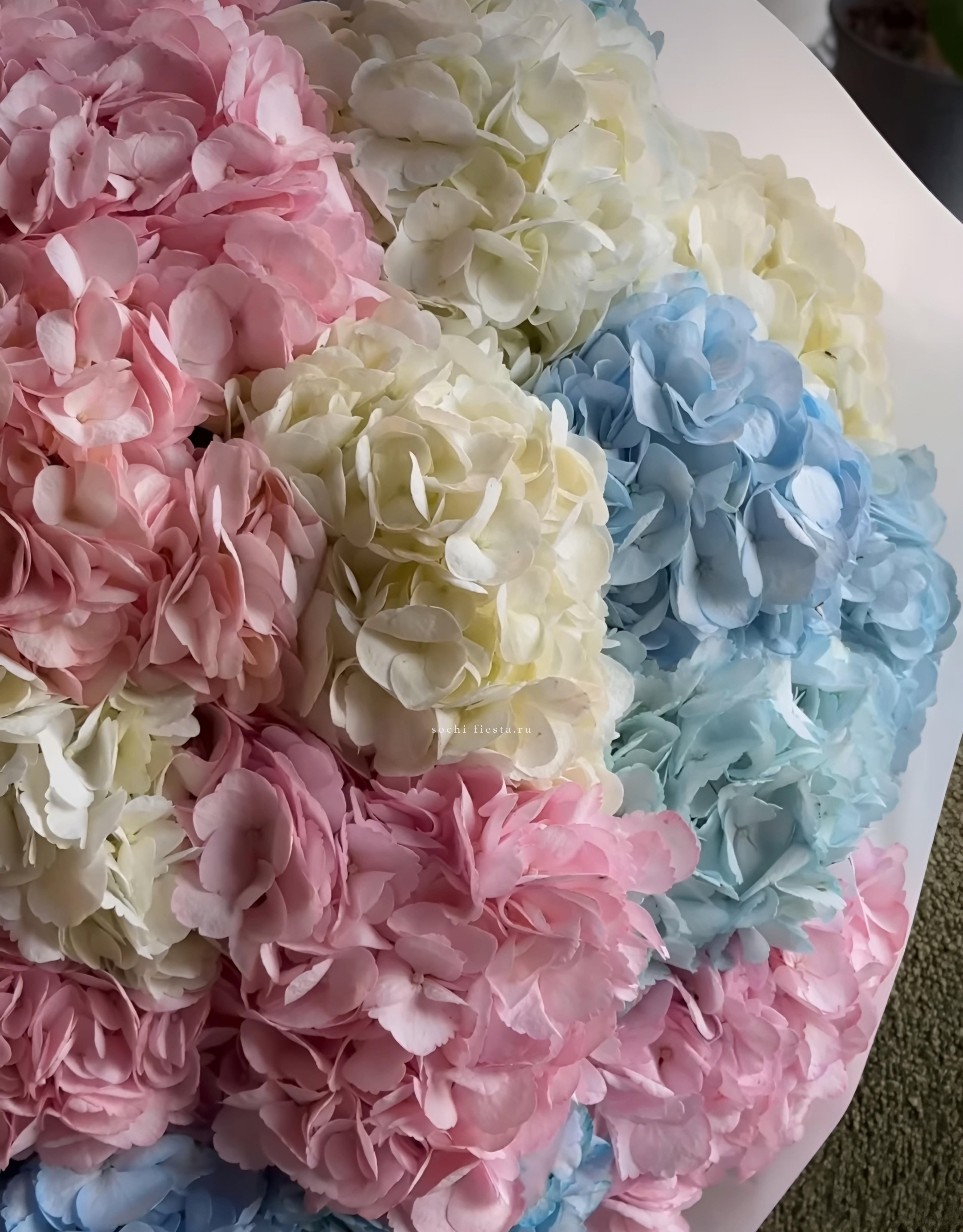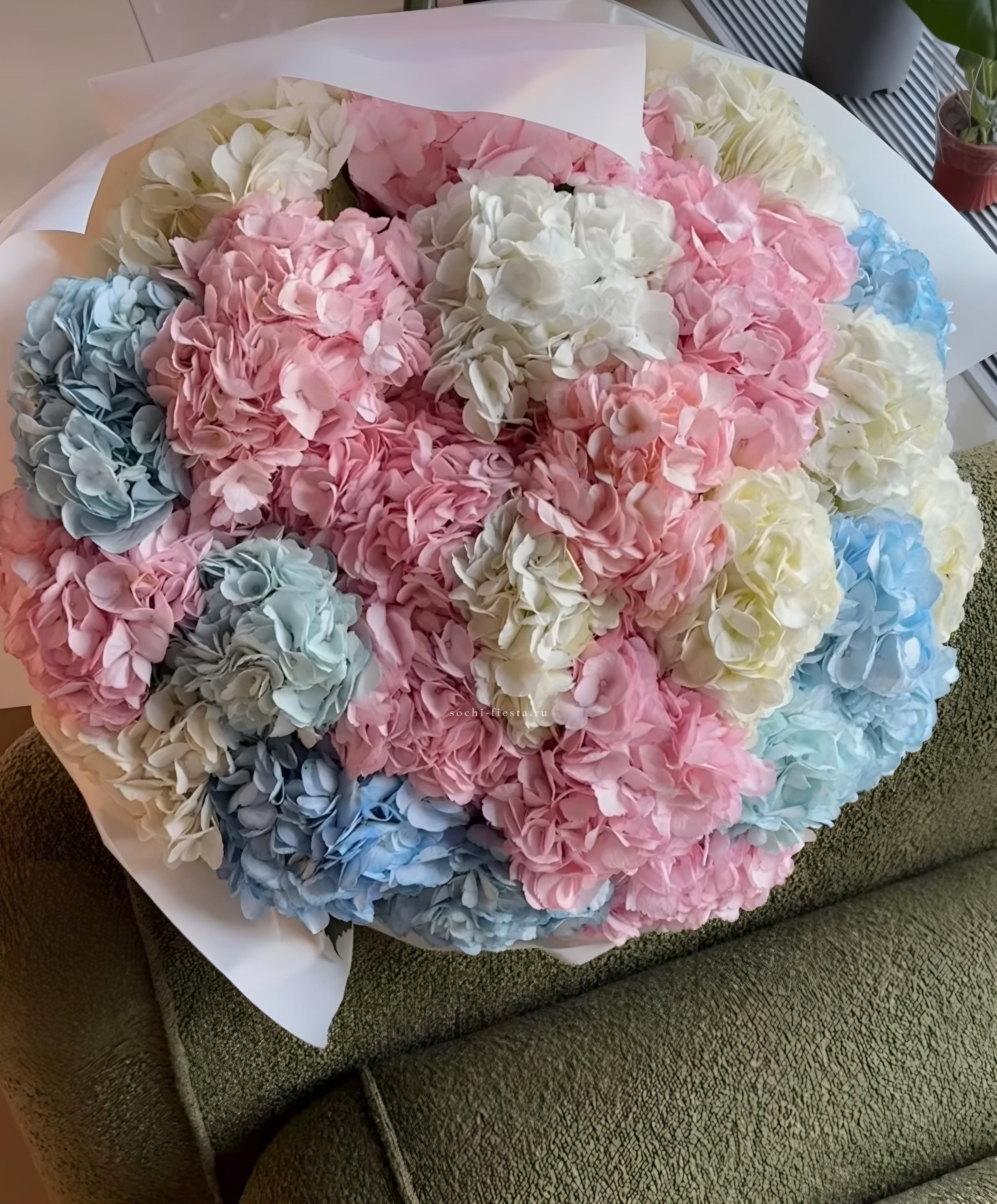 Пышная гортензия задаёт объём, а розы и диантусы наполняют композицию мягкими переходами оттенков. Эвкалипт добавляет воздушности, не перегружая форму. Букет собран так, чтобы каждый цветок читался отдельно, но работал на общую картину.