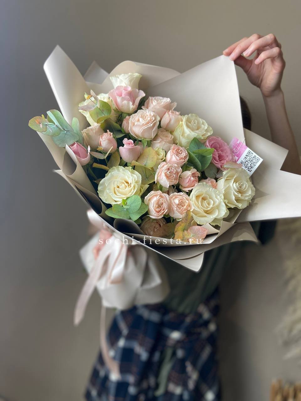 Одиннадцать вывернутых бутонов WhiteNice раскрываются волнами лепестков с матовым свечением. Эвкалипт добавляет воздуха между соцветиями.
