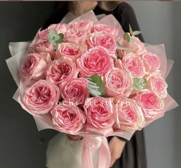 диантус, розовые розы, бомбастик, хризантемы, эустома, эвкалипт, бокс №20