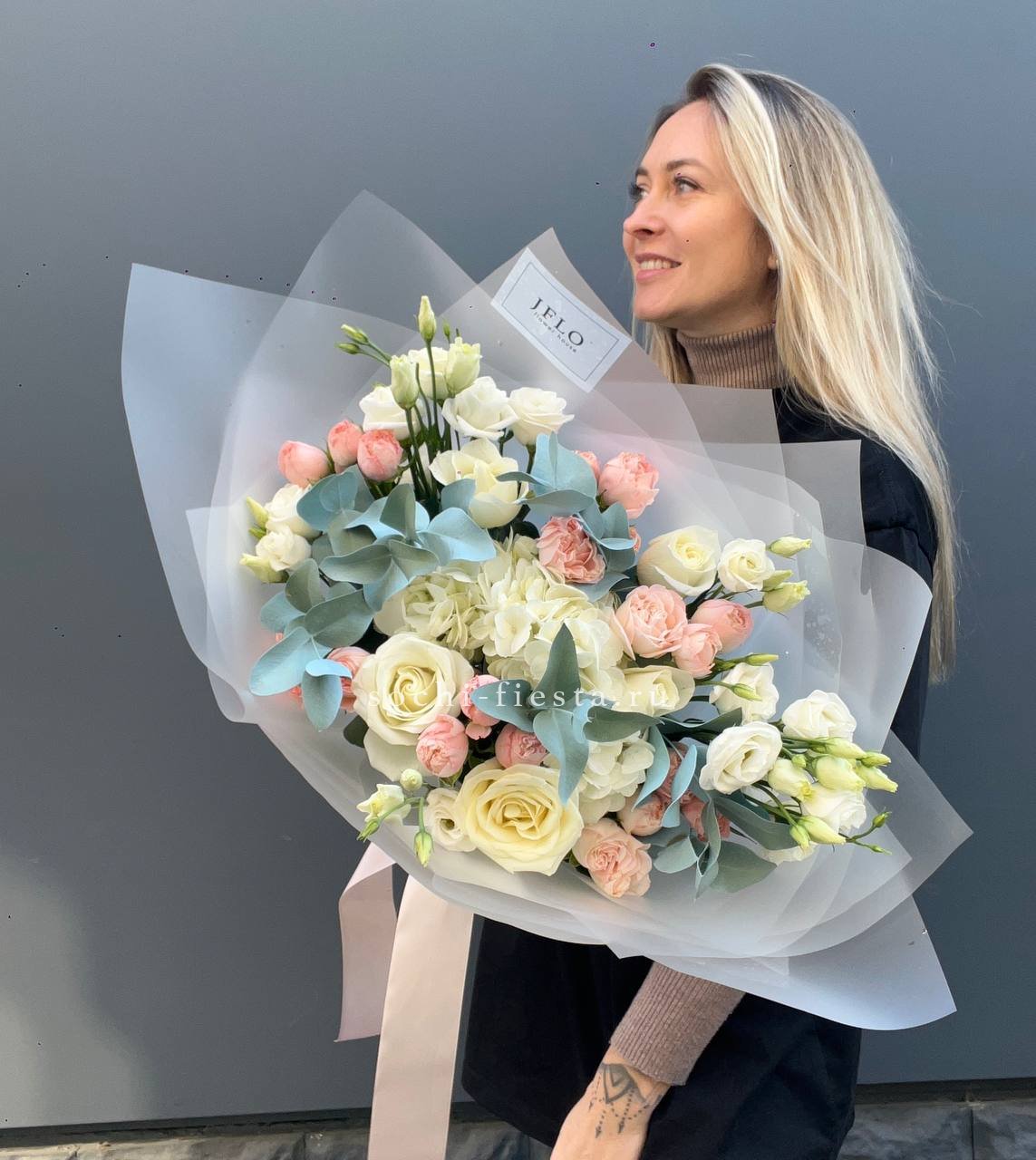 розы, гортензия, эустома, эвкалипт, дизайнерская упаковка.
