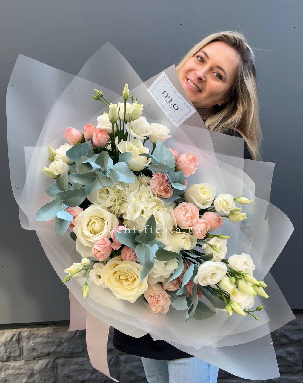Розы и гортензия формируют объемную текстуру, где каждый бутон раскрыт по-своему. Эустома заполняет пространство между крупными соцветиями, а эвкалипт обрамляет композицию мягкой зеленой волной.