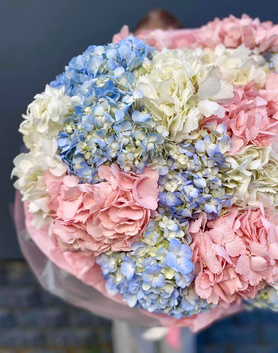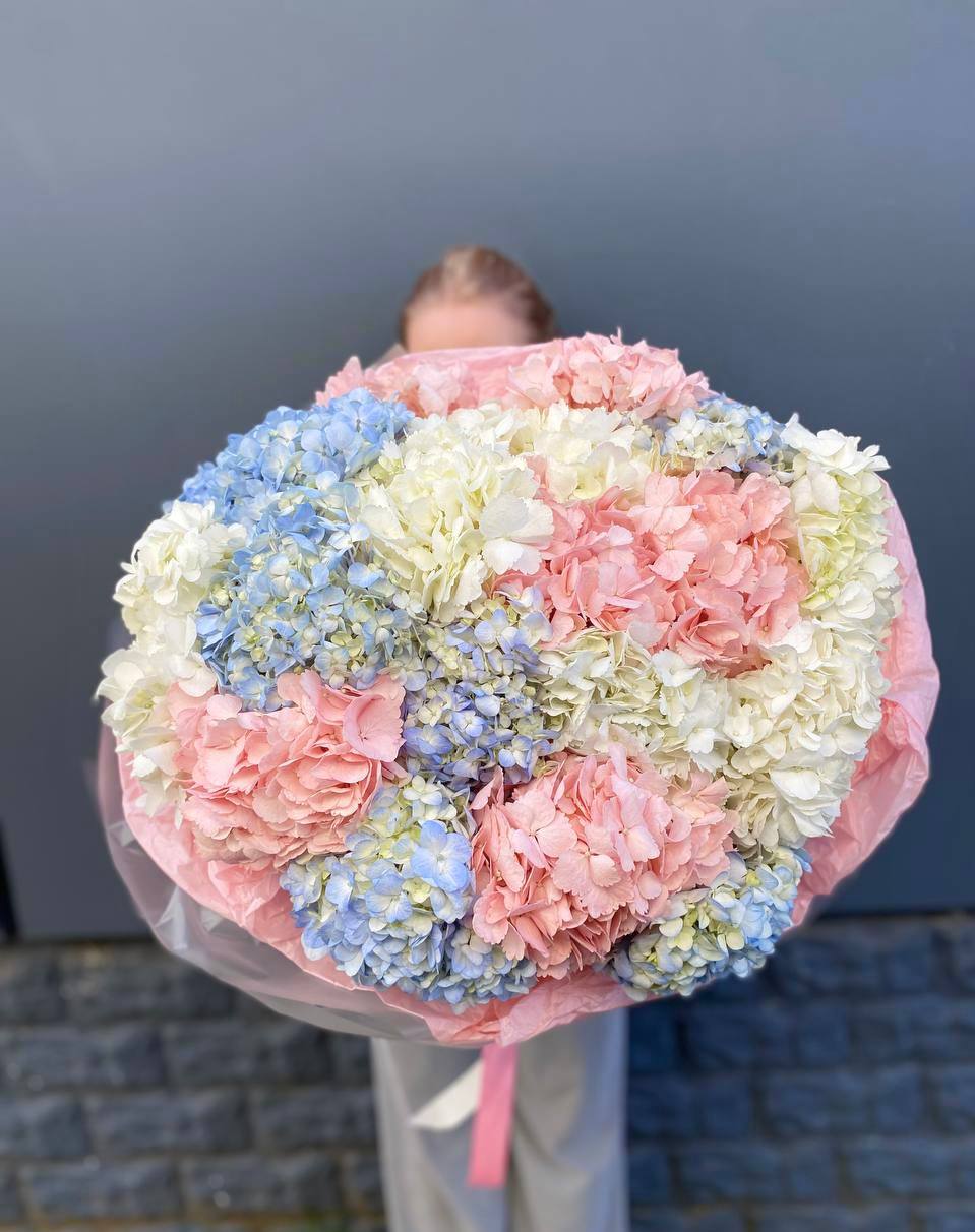 гортензия - 11 шт., пионовидная кустовая роза Мисти Баблс 7 шт., лента, дизайнерская упаковка.
