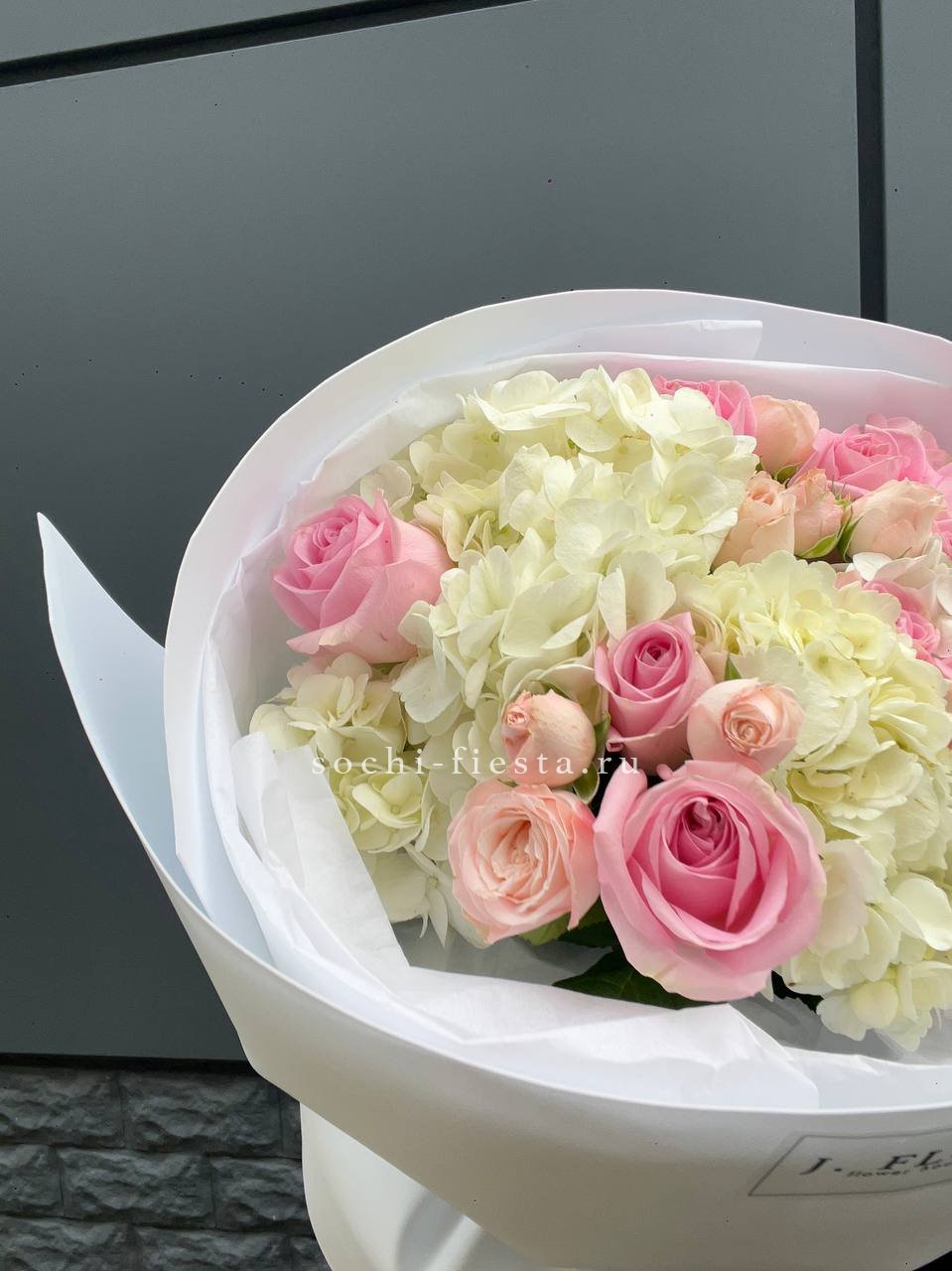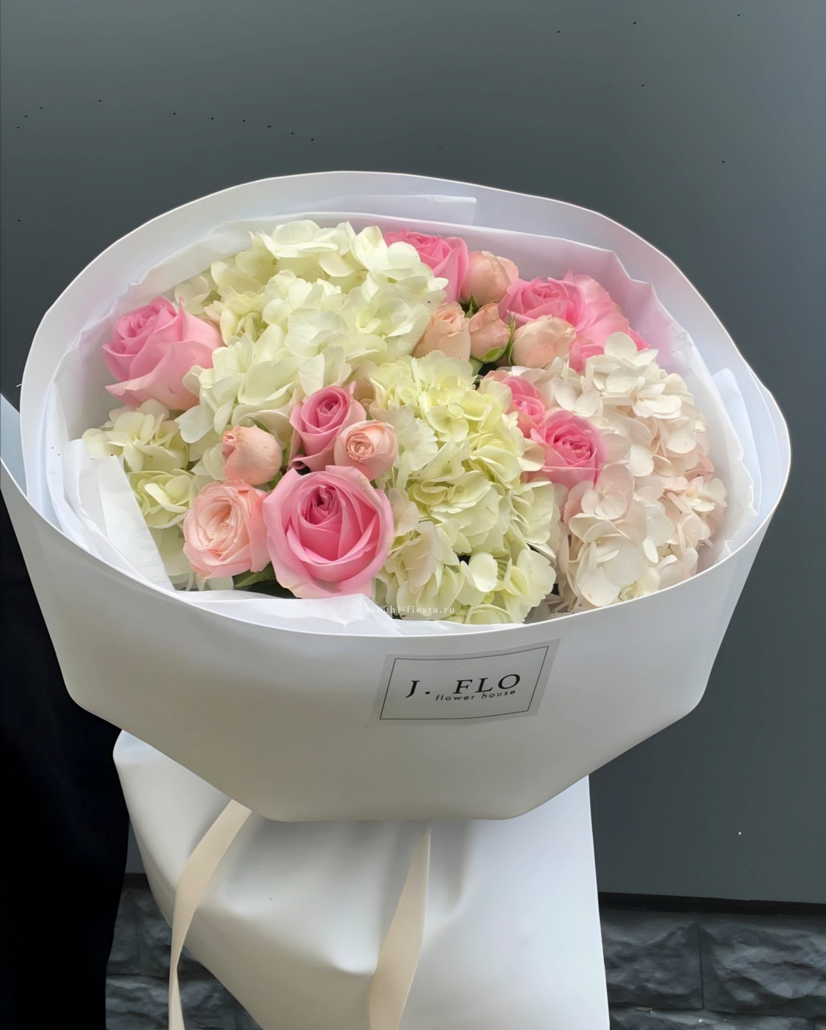 гортензия, герберы, эустомы, розы, диантус, эвкалипт, лента, дизайнерская упаковка.
