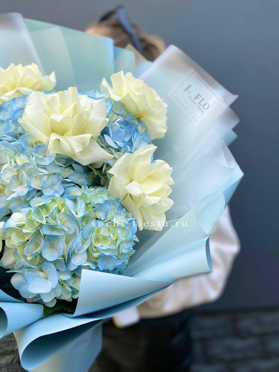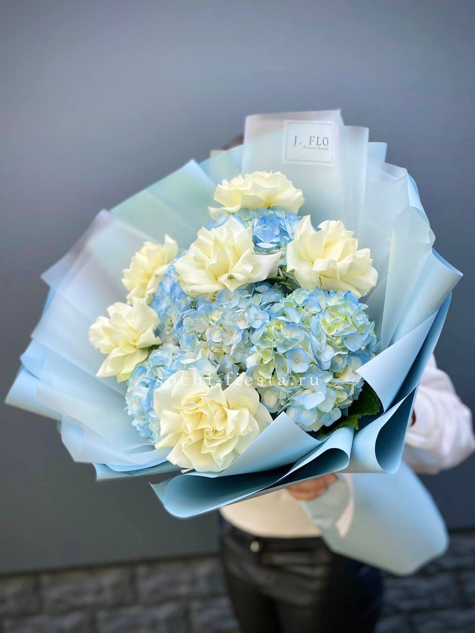 гортензия, розы джумилия, бомбастик, альстромерия, маттиола, чико, авторское оформление.