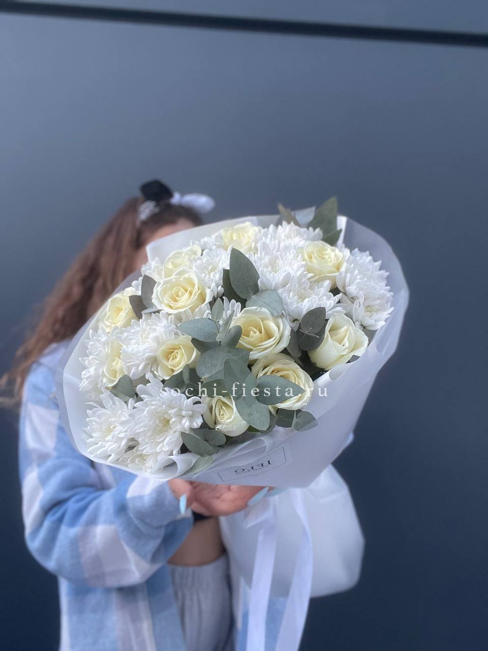 Белоснежные розы собраны в плотный круг и дополнены воздушными соцветиями кустовой хризантемы. Эвкалипт добавляет свежести и завершает композицию мягкими серебристыми оттенками. Букет держит форму и долго сохраняет безупречный вид.