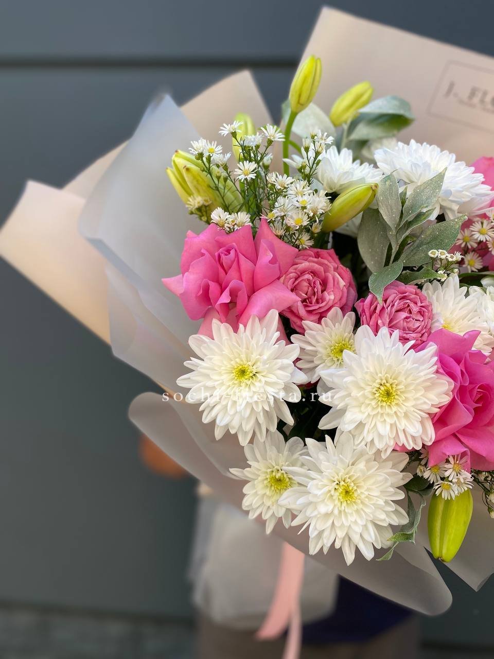 хризантема кустовая, лилии, розовые розы, кустовые розы, ромашки в оформлении.
