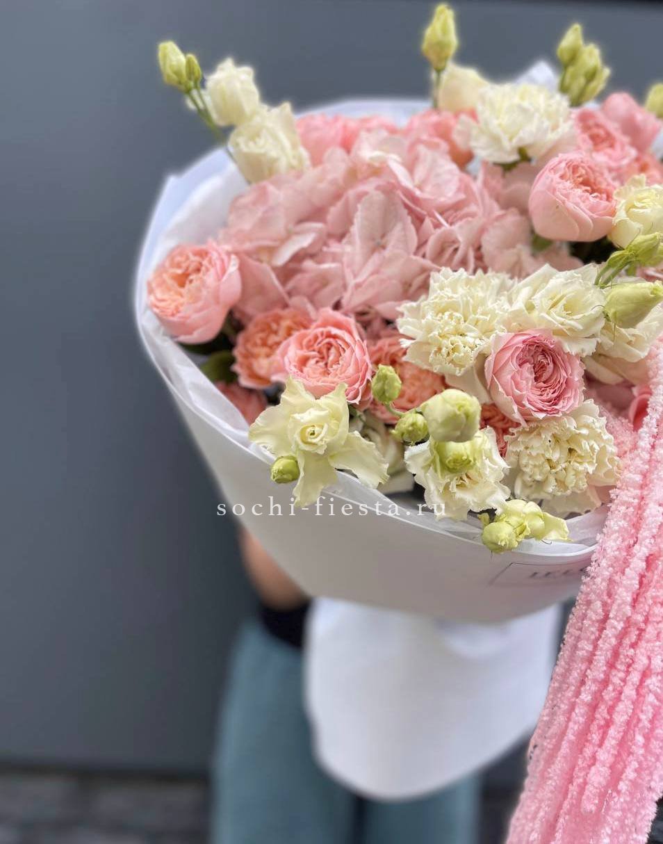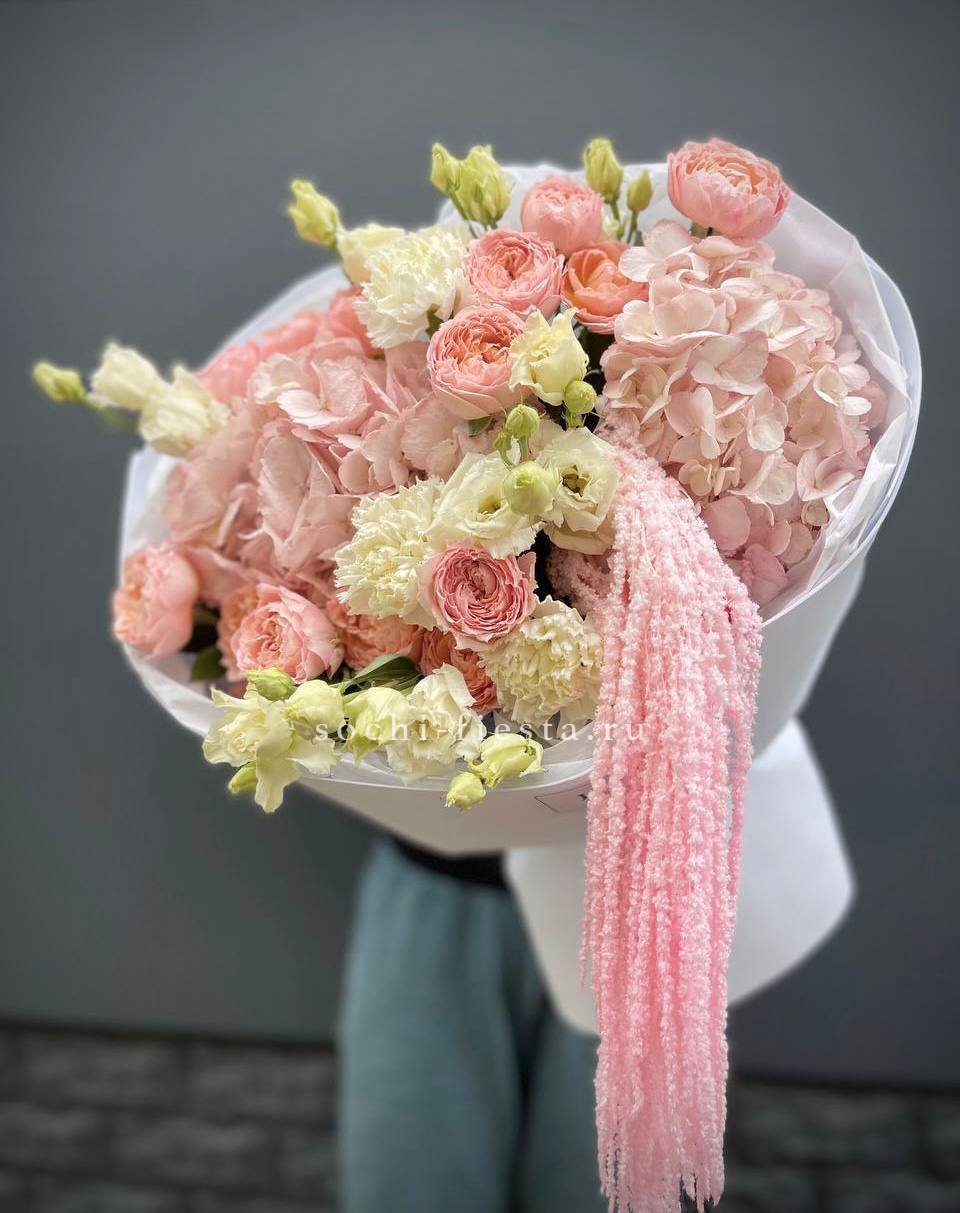 кустовые розы, гортензии, диантусы, эустома, амарант, лента и дизайнерская пленка.