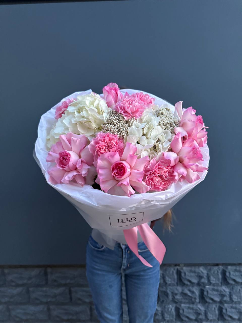 гортензия, роза кустовая, ковыль, лента, дизайнерская пленка.