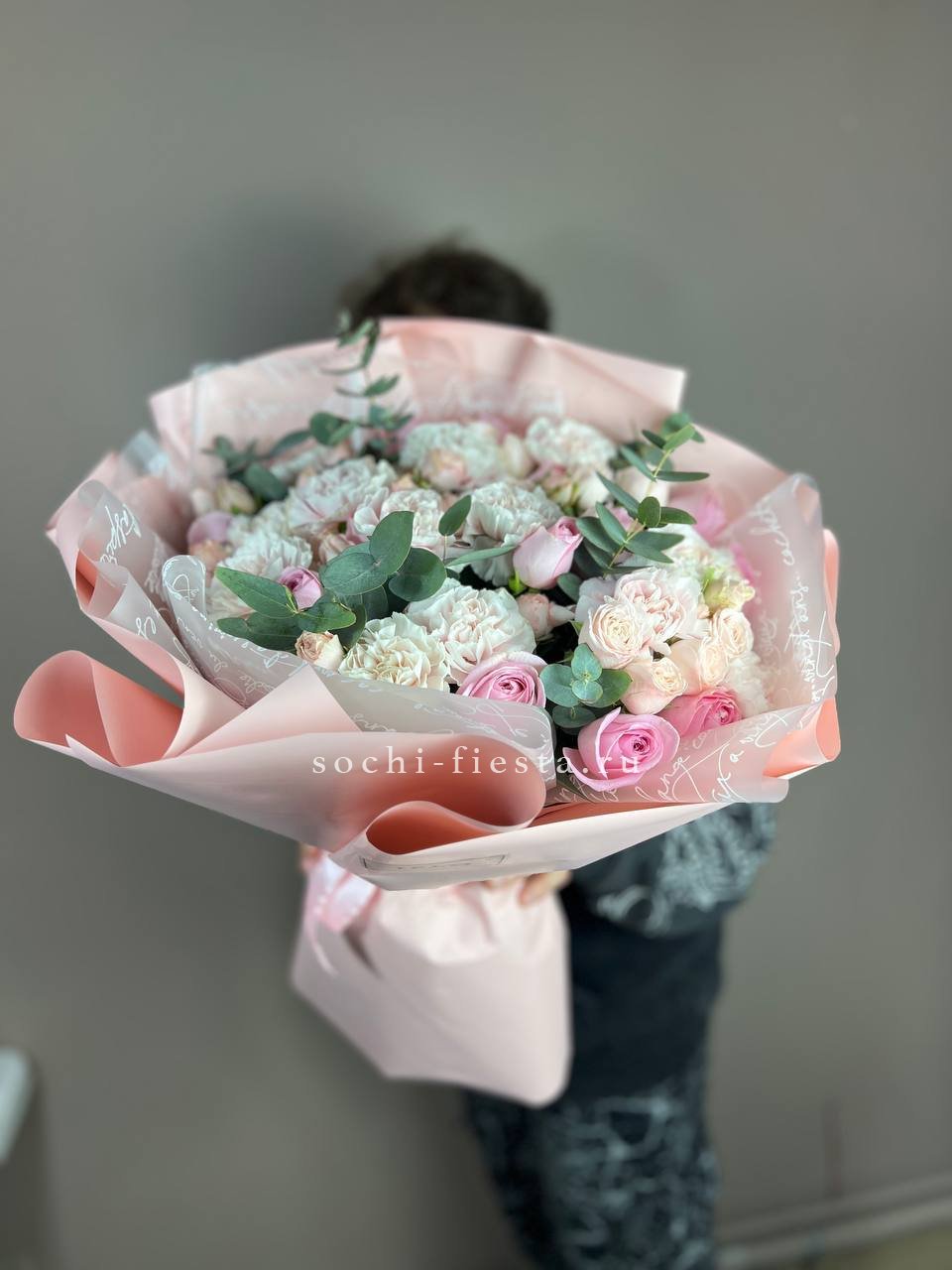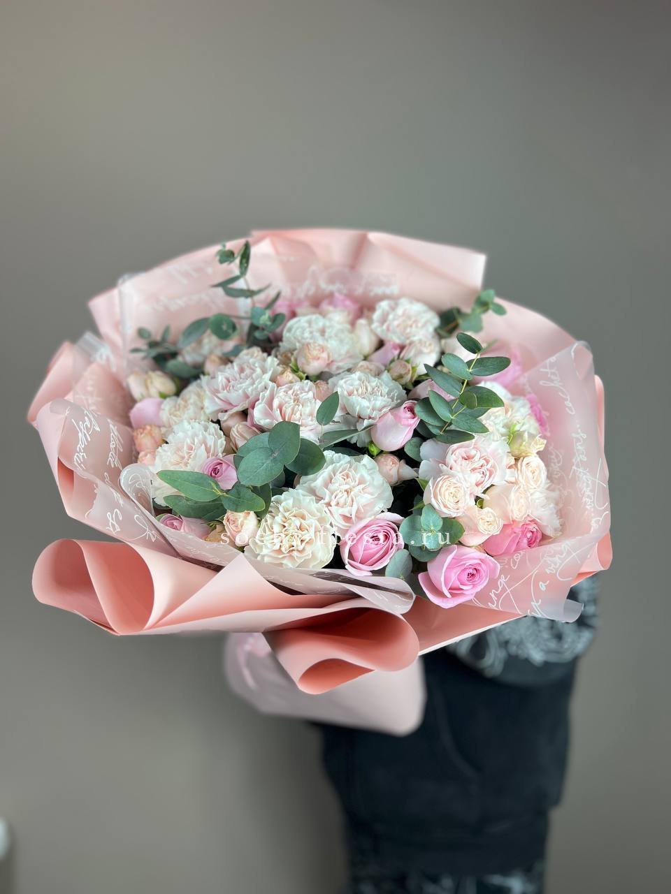 Воздушные соцветия кустовой хризантемы чередуются с яркими головками диантусов. Эвкалипт обрамляет букет серебристой зеленью, создавая лёгкое и свободное настроение.