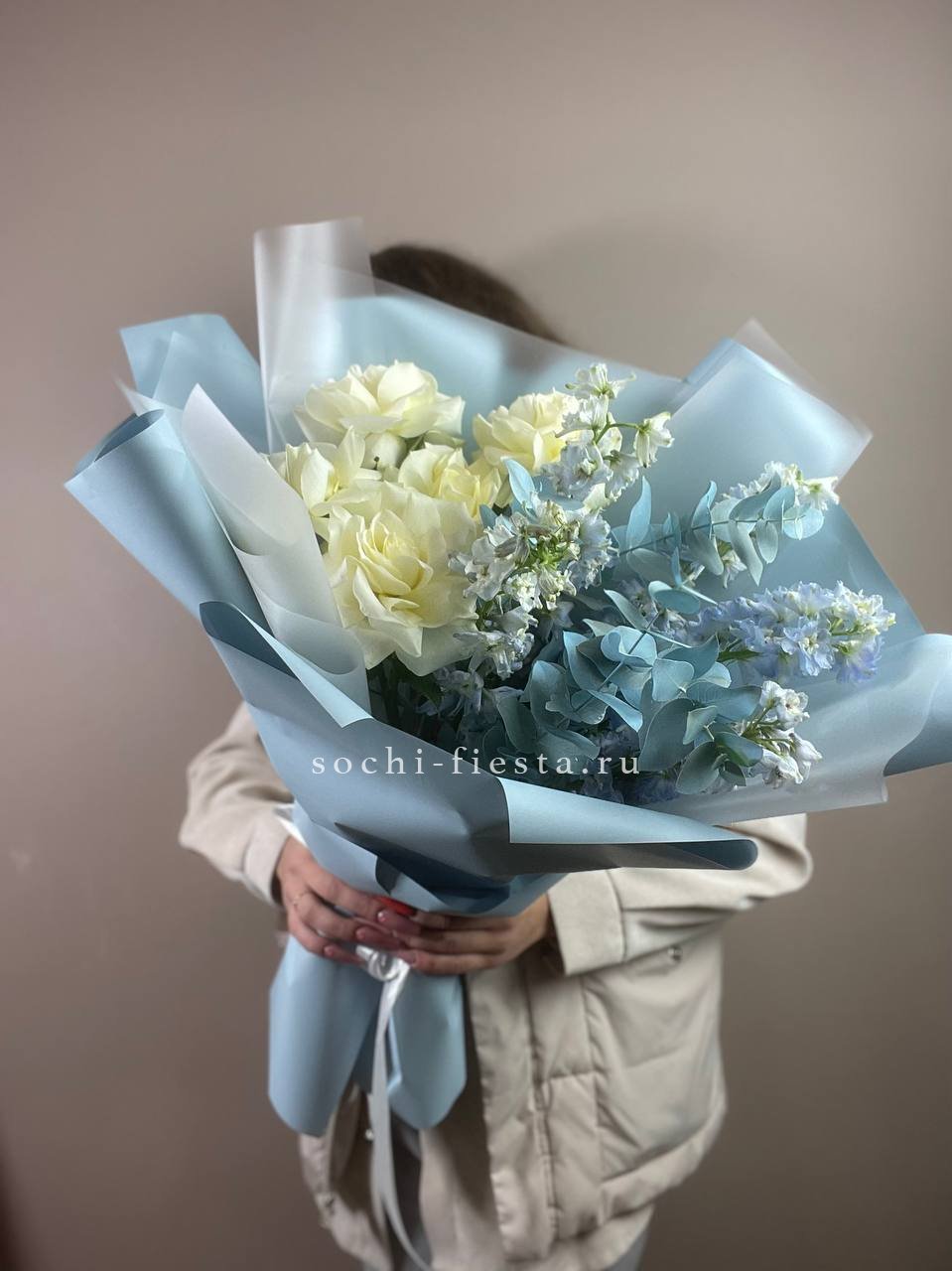 Вывернутые французские розы образуют плотную светлую сферу, которую прорезают вертикали синего дельфиниума. Эвкалипт добавляет графику по краю, создавая четкую границу между белым и зеленым.