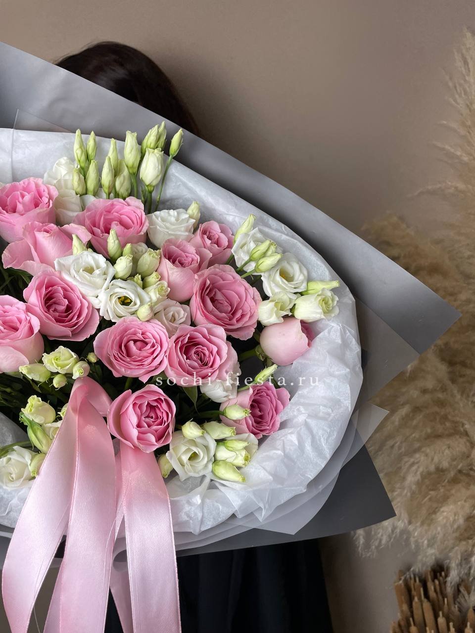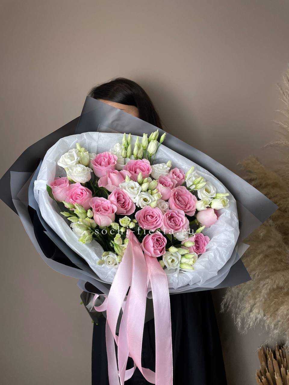 пионовидная роза, сирень, дизайнерское оформление, лента.