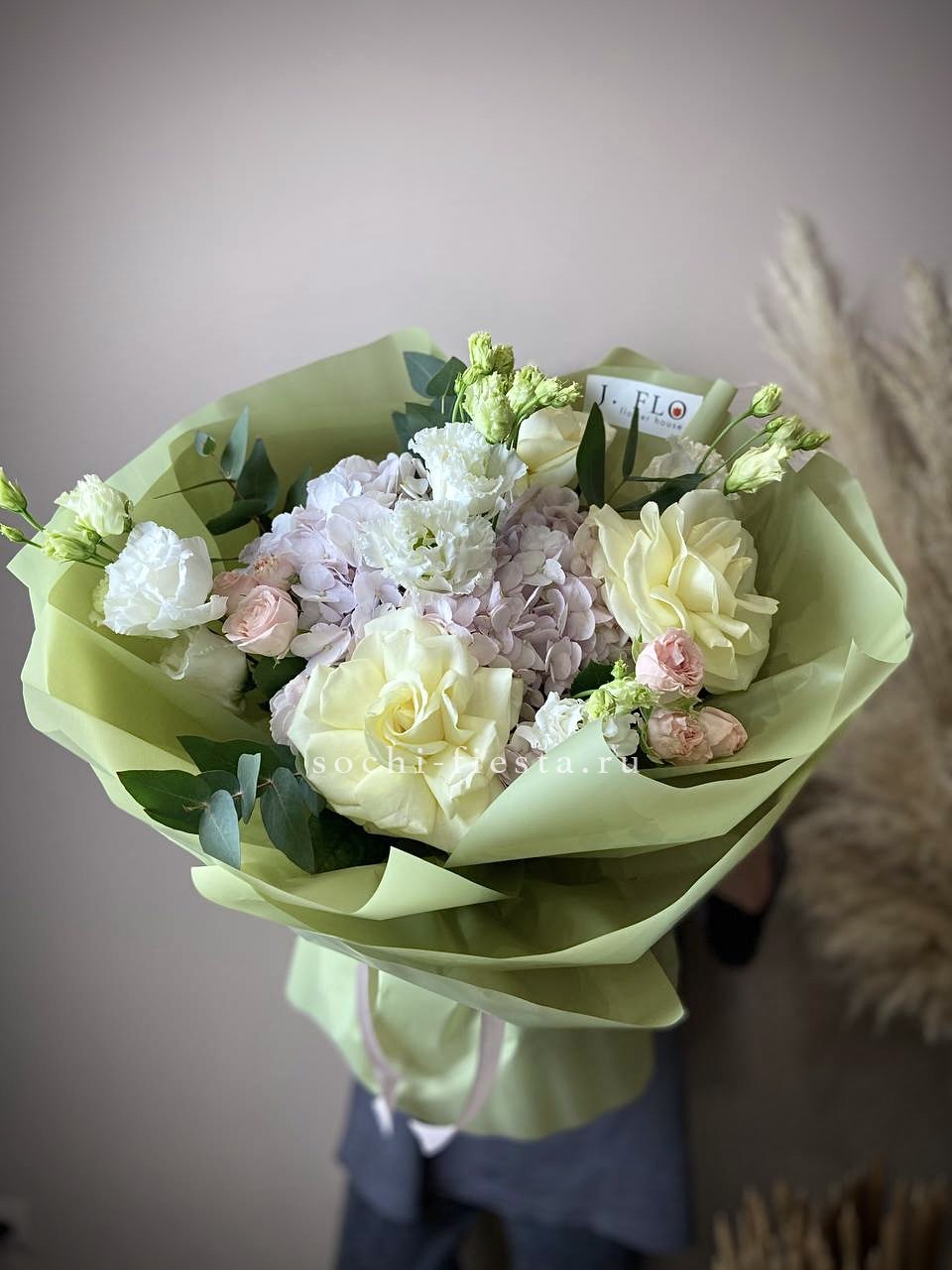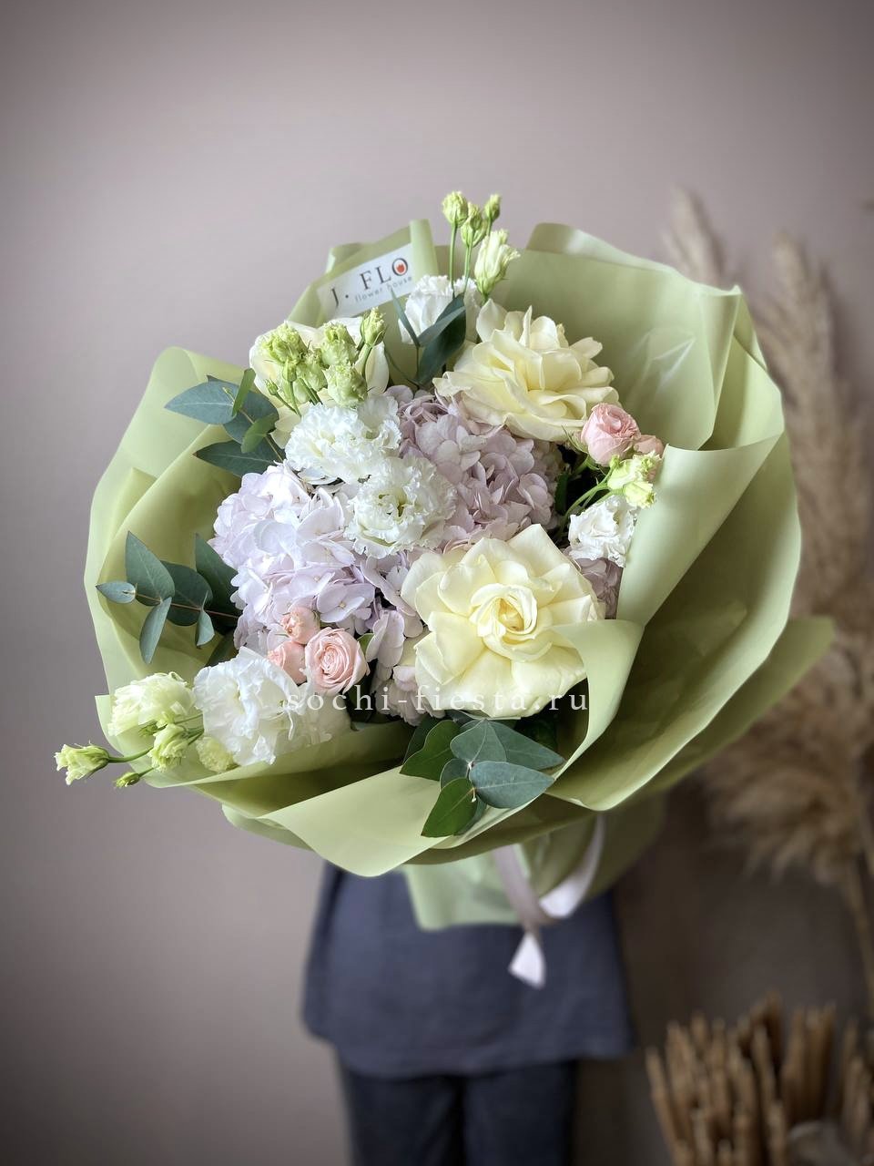Воздушная композиция с крупными соцветиями гортензии и пышными розами создает ощущение легкости и объема. Эвкалипт добавляет свежести, а бомбастик расставляет яркие акценты между бутонами.