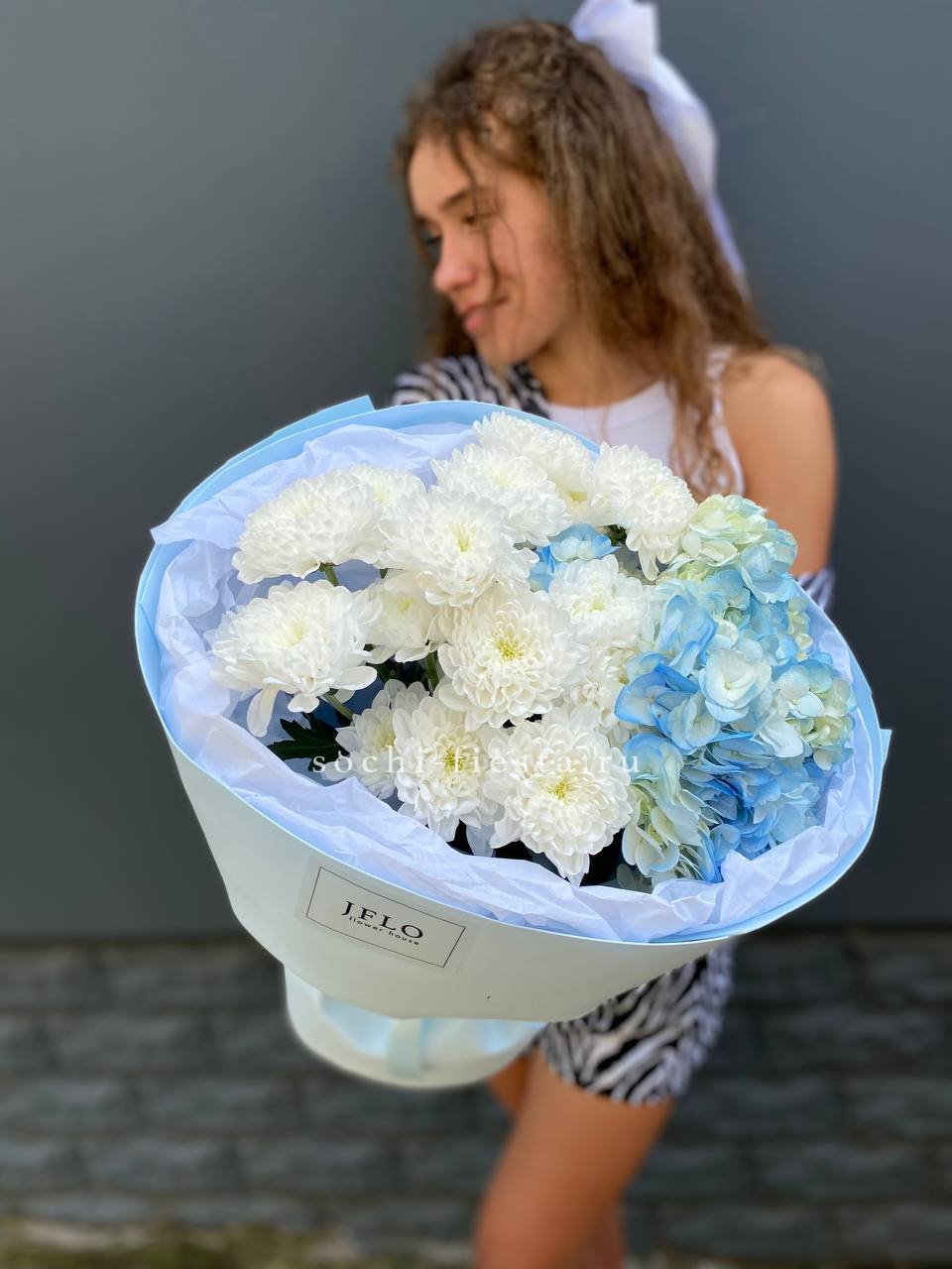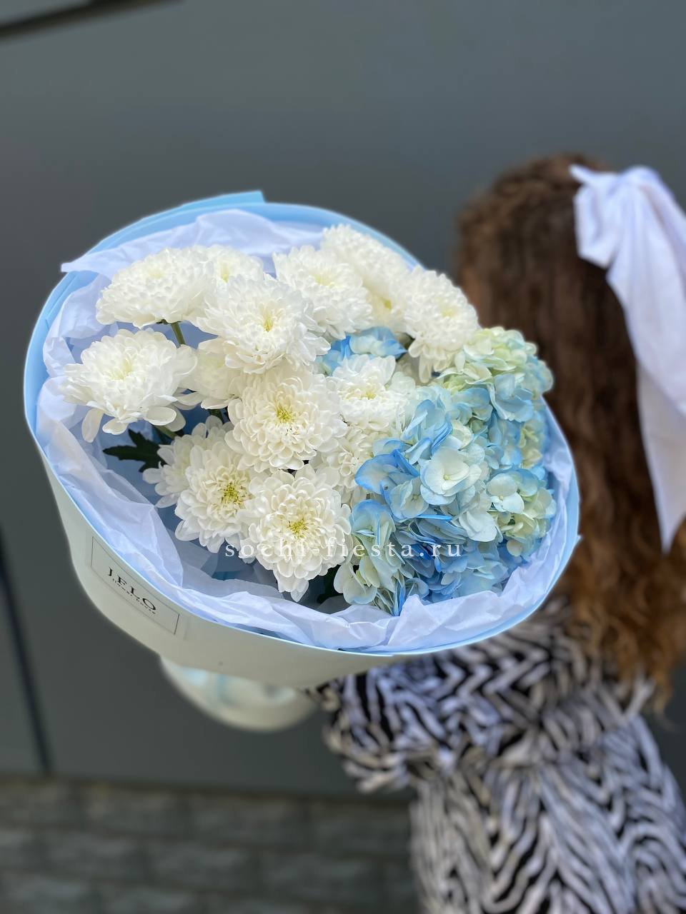 гортензии, хризантемы, лента и дизайнерская пленка.