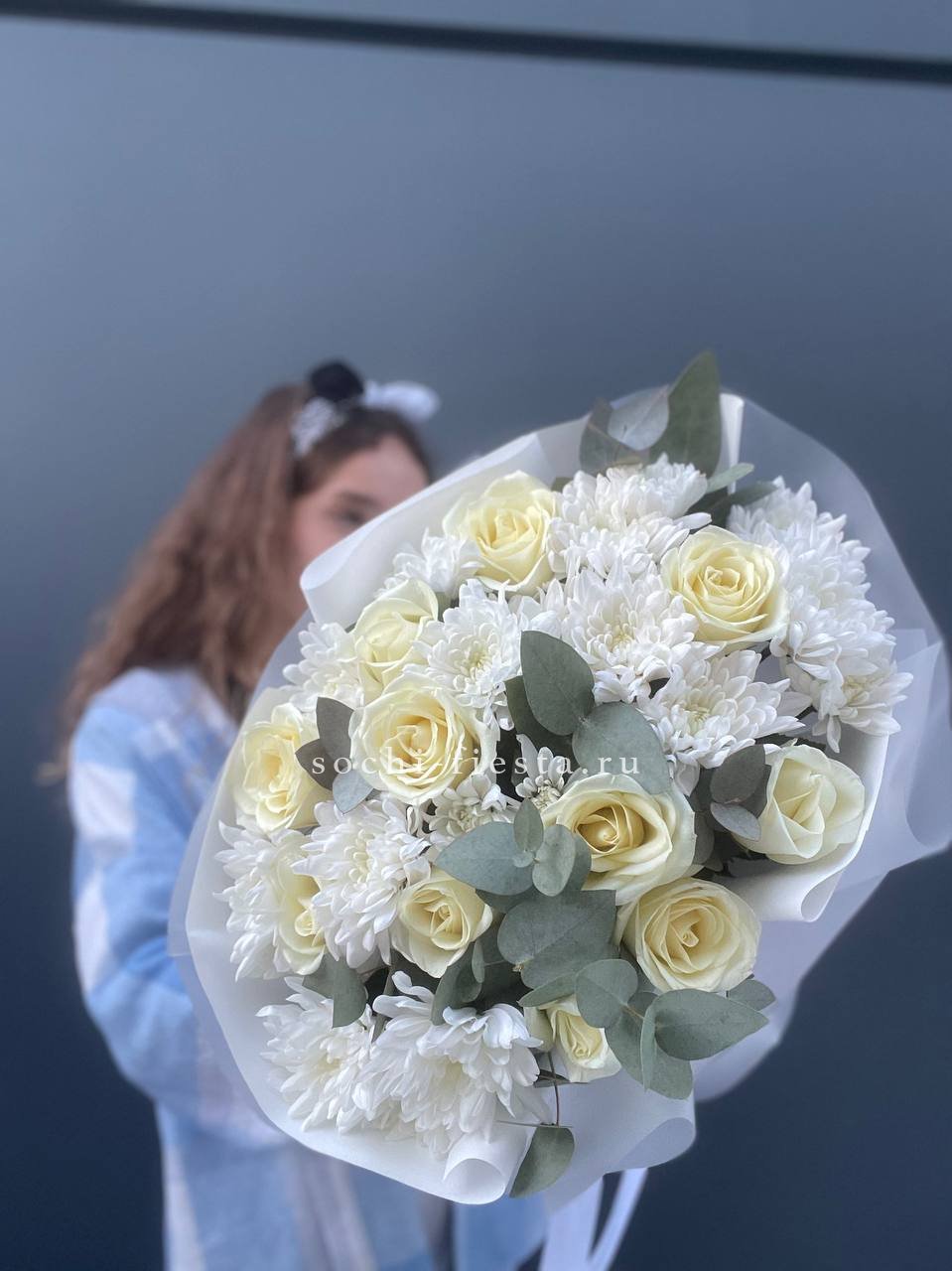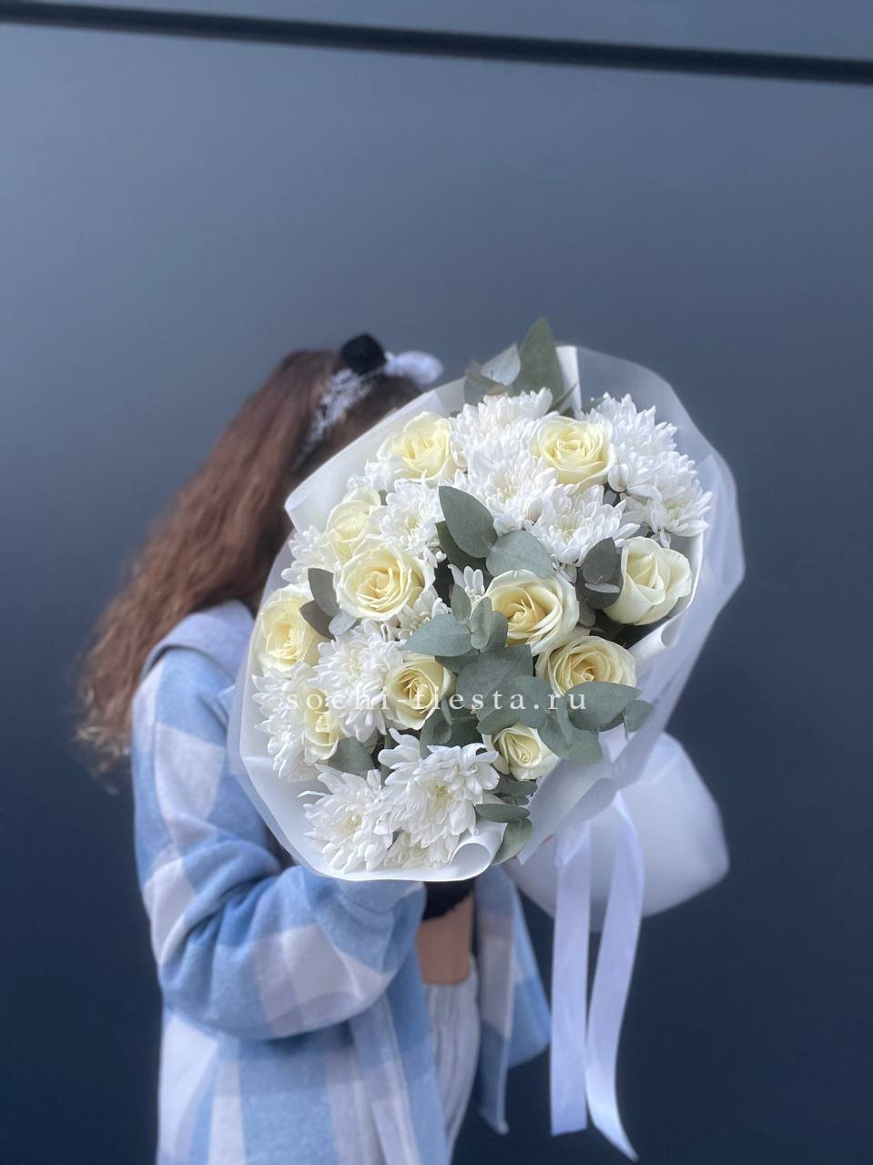 Белоснежные розы и пышные шапки гортензии сплетаются в плотную композицию, где эвкалипт задаёт спокойный ритм. Букет хорошо держит форму и долго сохраняет свежесть в вазе.