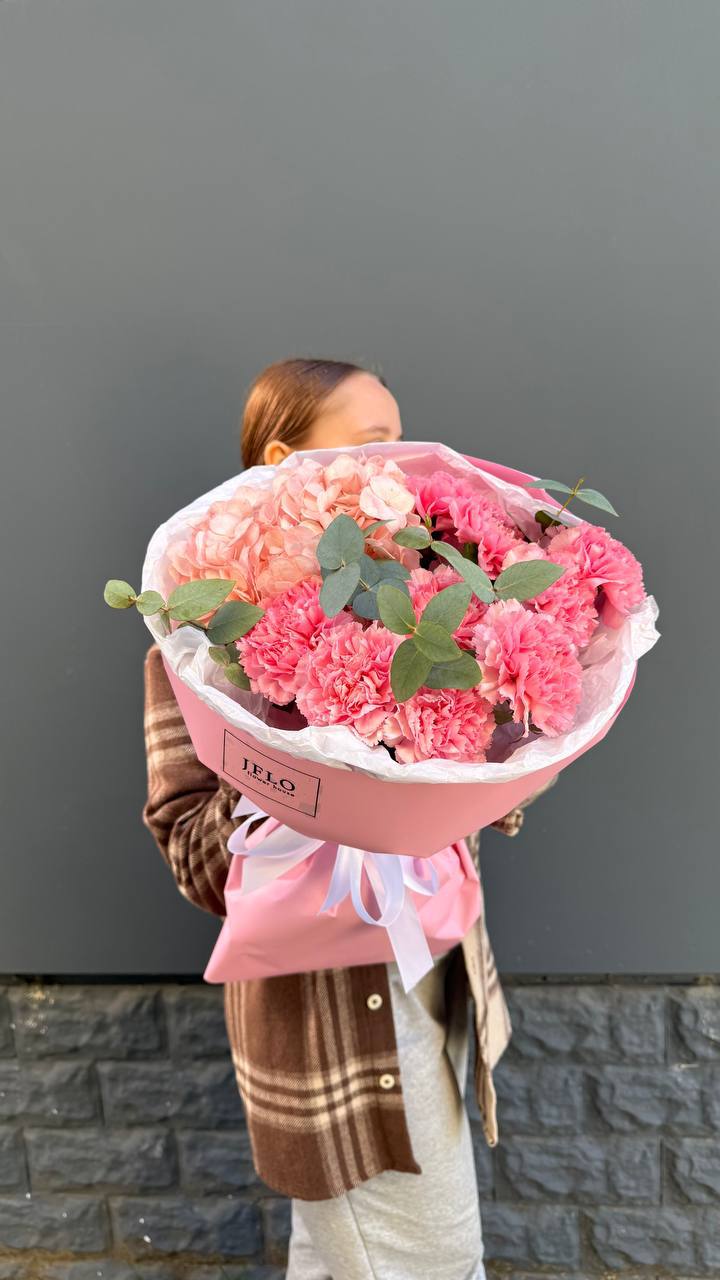 Гортензия образует пышную основу, сквозь которую проступают светлые головки эустомы и роз. Бомбастик вносит графичность, создавая объём и глубину.