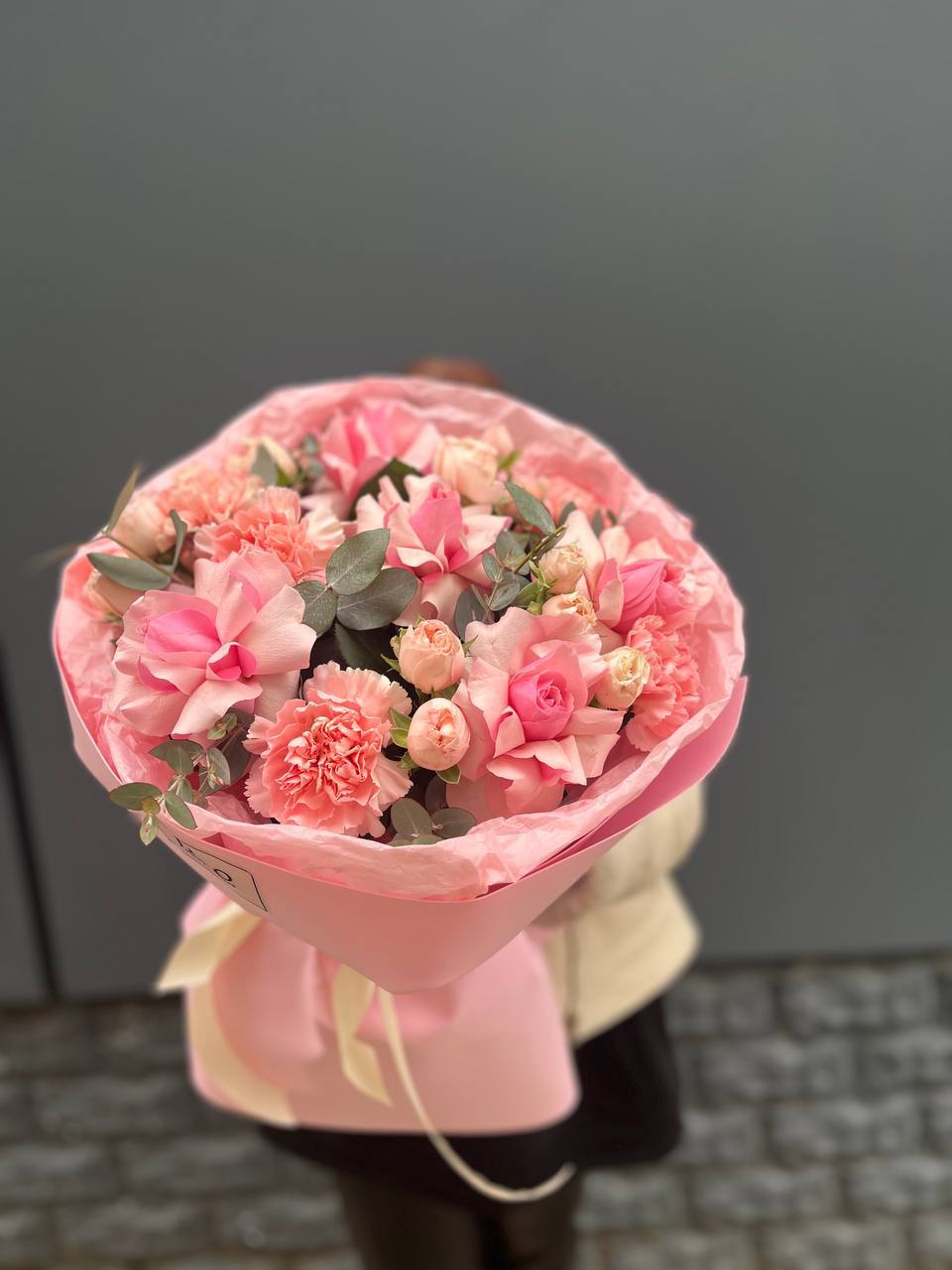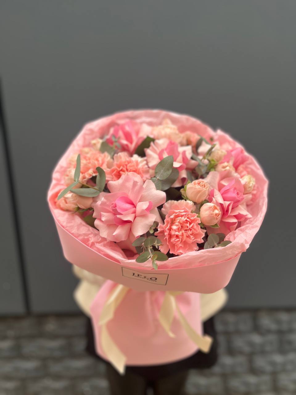 Lucrecia собрана из пионовидных и классических роз с добавлением пушистых кустовых хризантем. Букет легко впишется в современный интерьер и поддержит спокойную эстетику пространства.