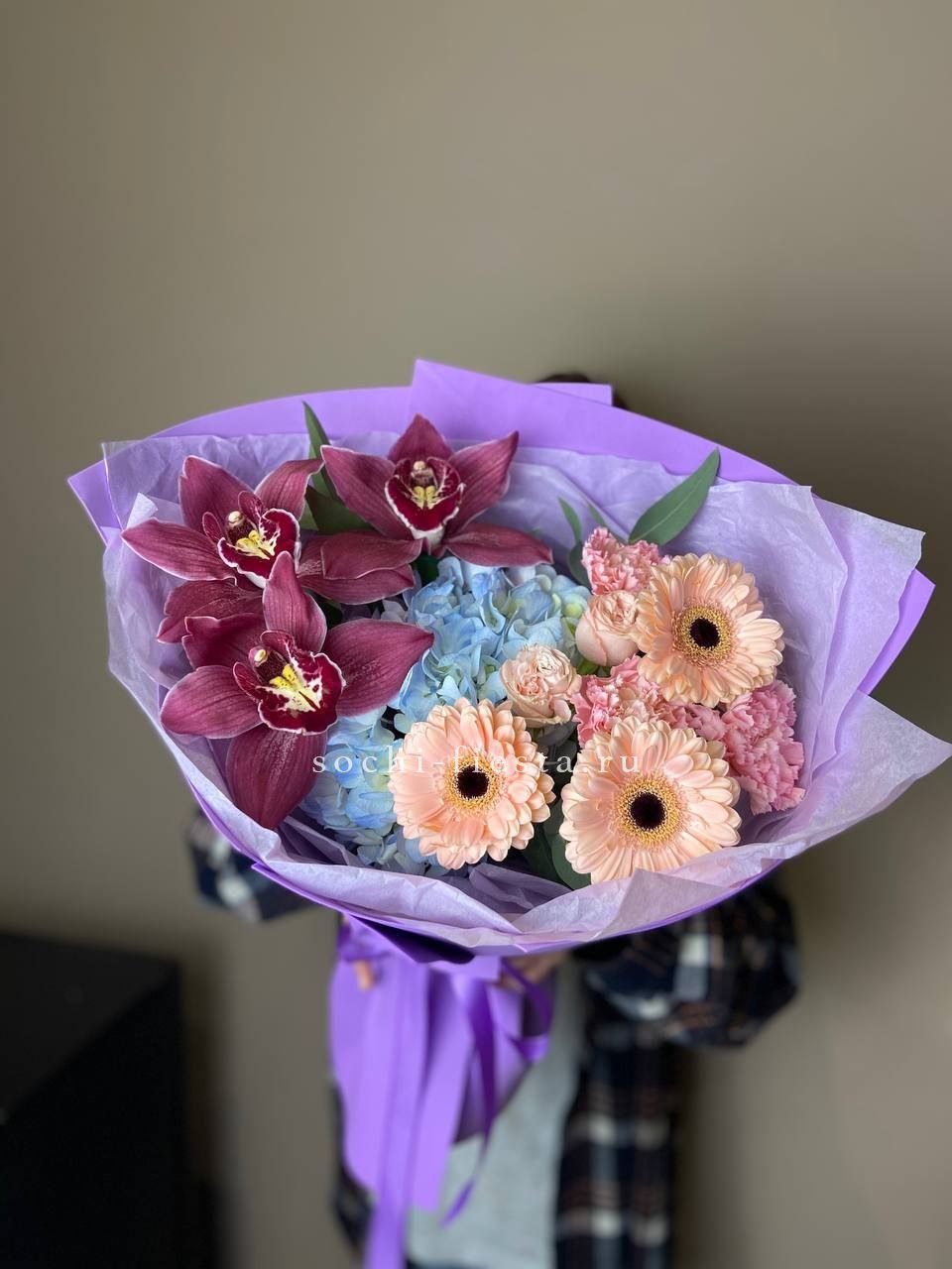 Сливовые оттенки гортензии переплетаются с пудровыми розами Бомбастик и яркими акцентами гербер. Орхидеи добавляют вертикали, а эвкалипт смягчает силуэт лёгкой зеленью.