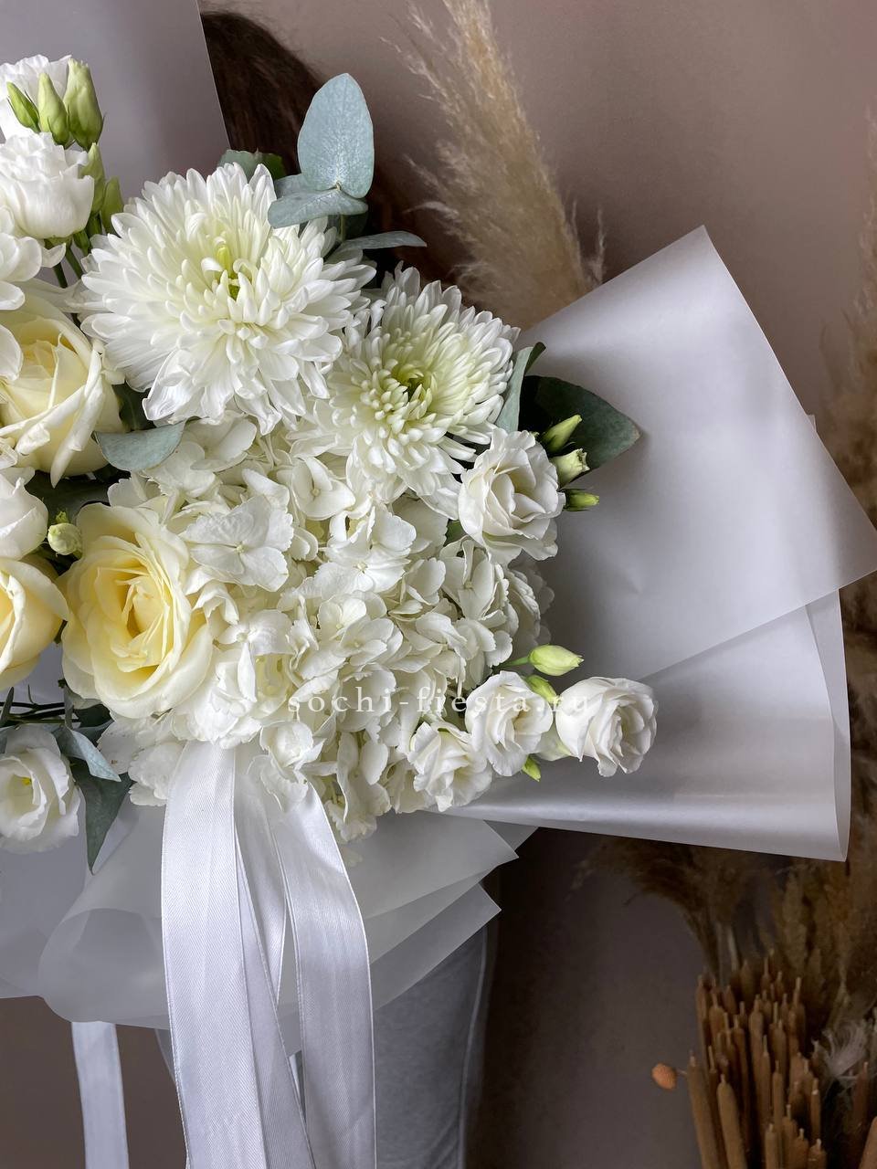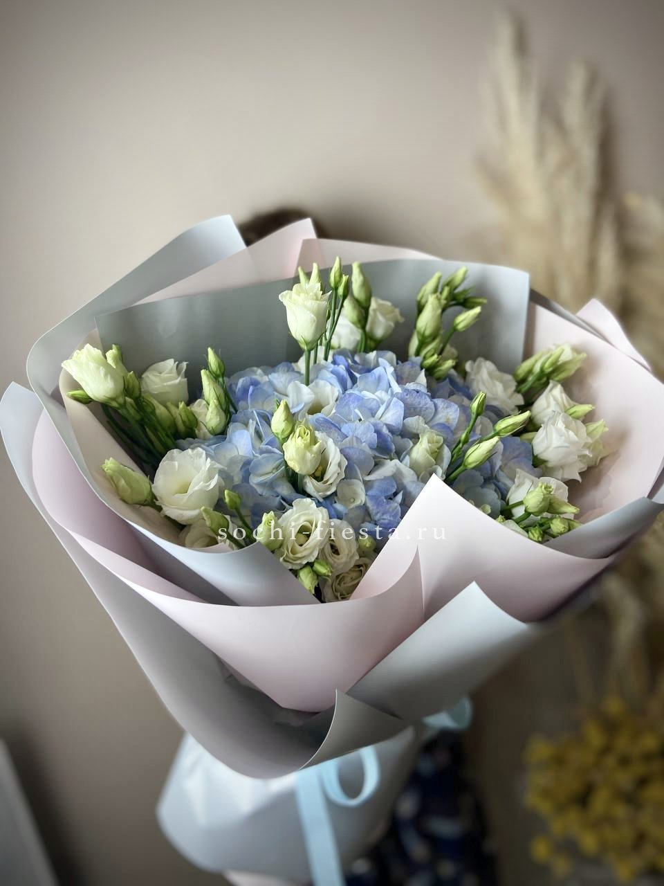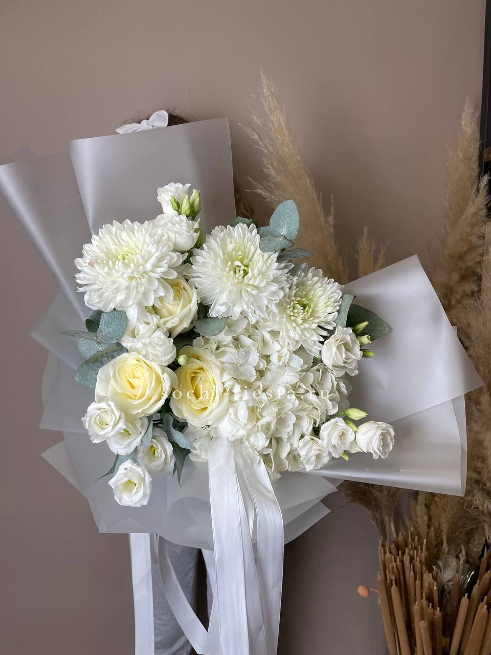 диантус, эустома, гортензия, хайди, эвкалипт, озатамус, пленка.