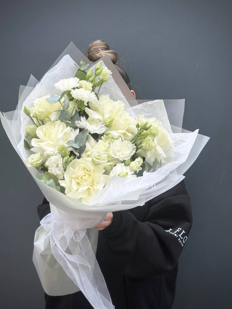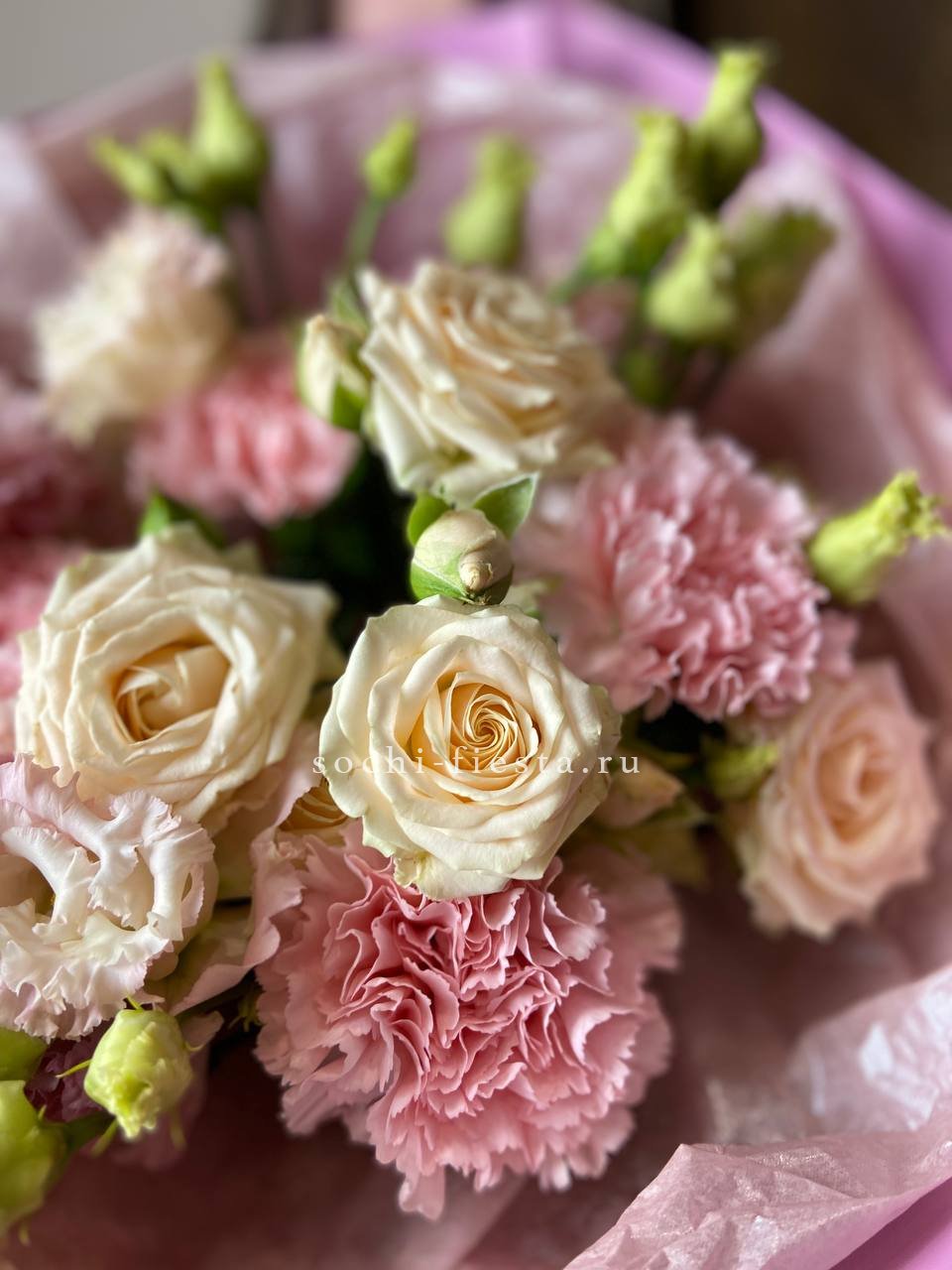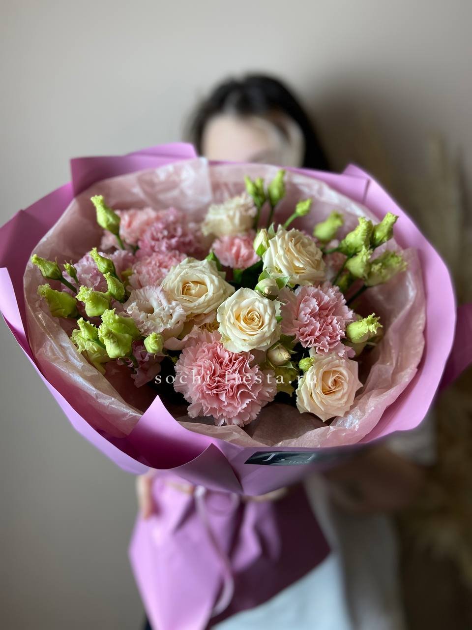 диантус, эустома, гортензия, хайди, эвкалипт, озатамус, пленка.
