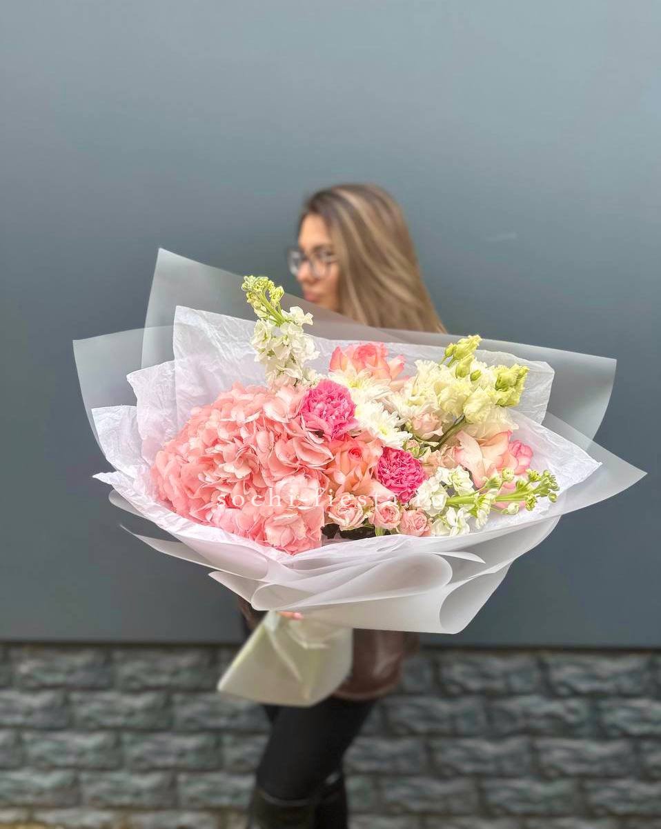 Герберы и гортензия создают воздушную композицию с лёгким ритмом и плавными переходами. Бомбамстик добавляет графики, а диантус смягчает общую форму.