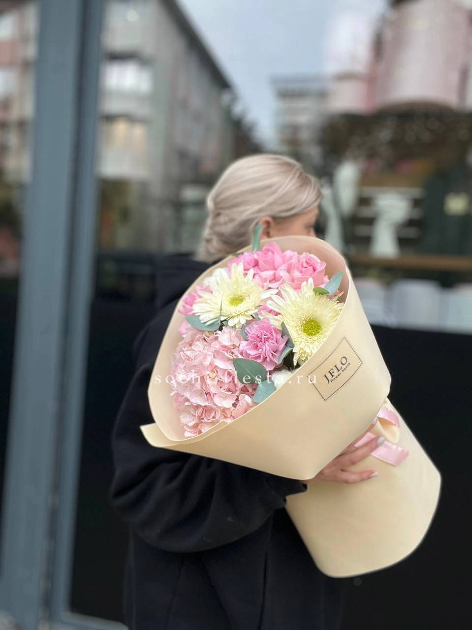 гортензия, бруния, роза, диантусы (или эустома), хризантема, пионовидная кустовая роза, эвкалипт, помпас, дизайнерское оформление.