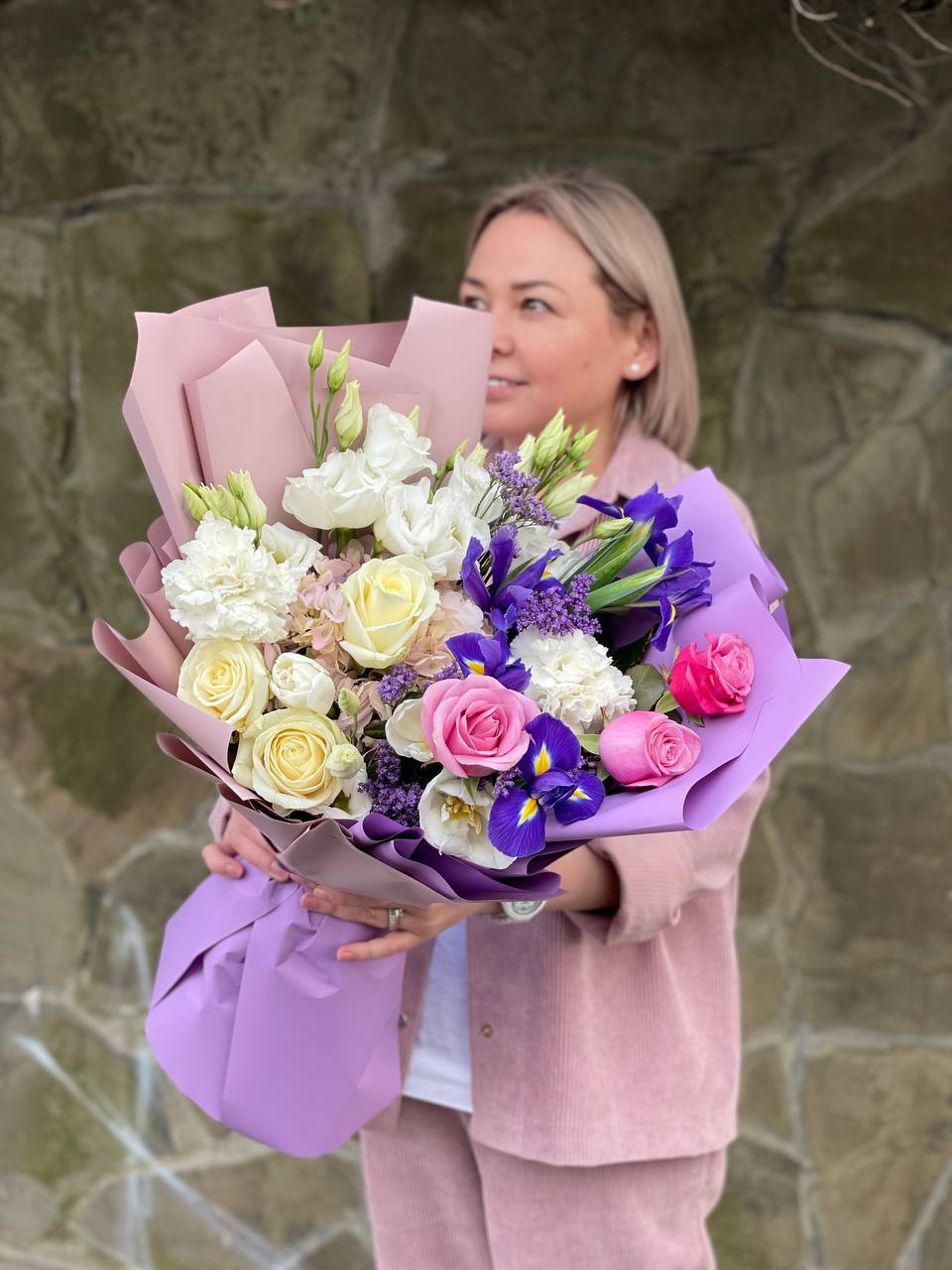 Гортензия задаёт объём, вокруг которого разворачивается многослойная история из эустомы, ирисов и роз. Лимониум и диантус заполняют пространство между крупными бутонами, создавая плотную текстуру.