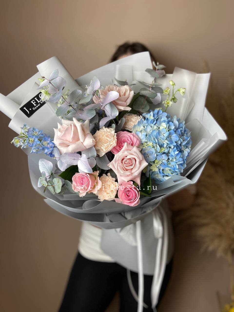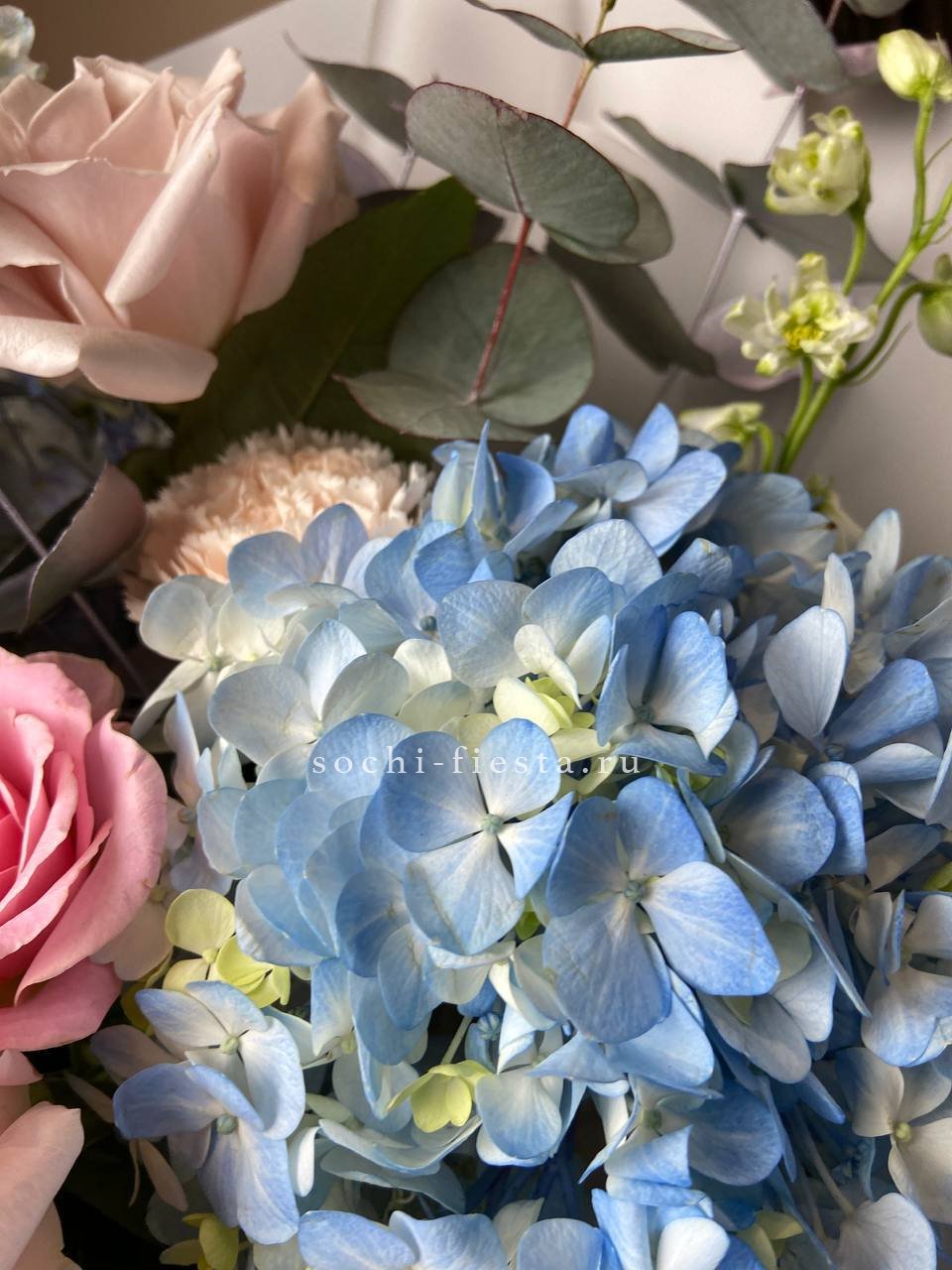 гортензия, пионовидные розы, эустома, эвкалипт, вспомогательный декоративный цветок, лента, дизайнерская упаковка.