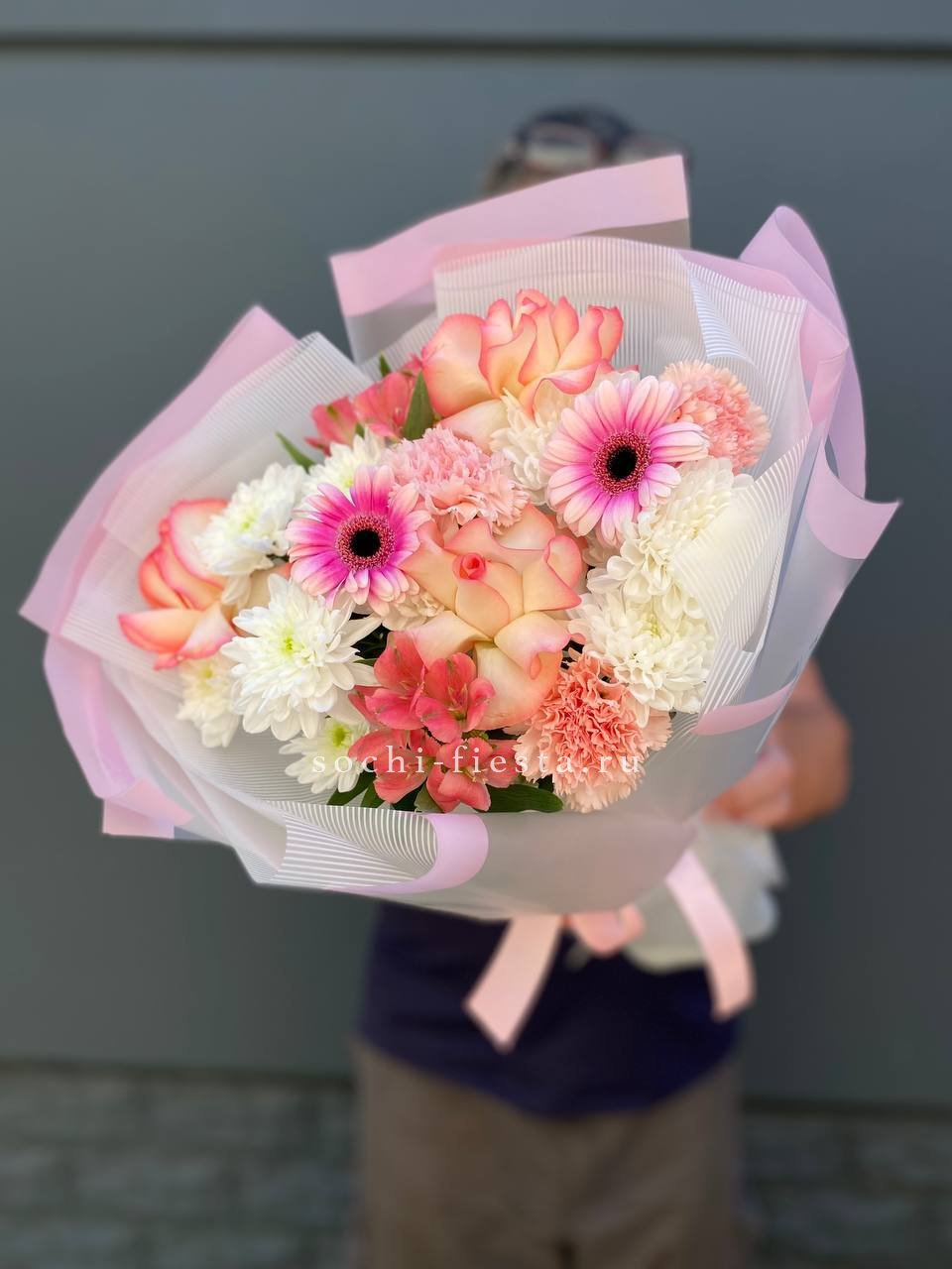 хризантема кустовая, гербера, роза французская, диантус, альстромерия, лента, дизайнерская пленка.
