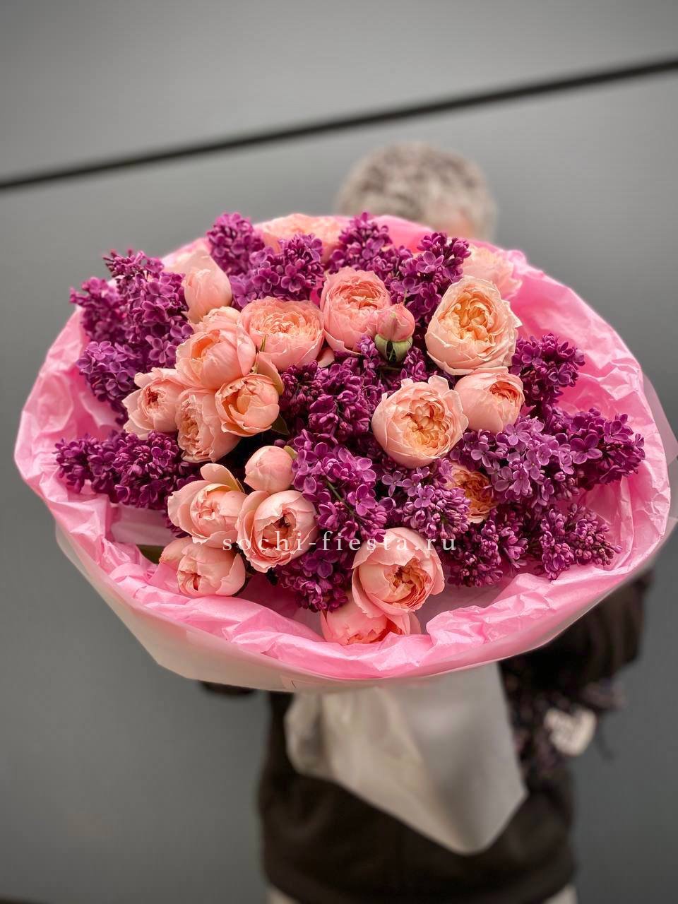 Весенняя встреча сирени и пионовидных кустовых роз в лёгкой упаковке. Ароматный дуэт для тех, кто ценит естественность и простоту.