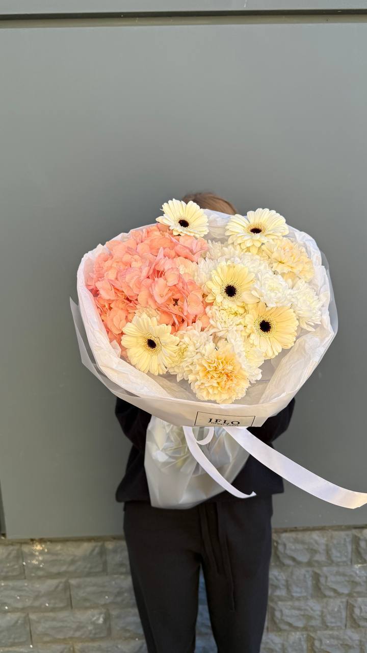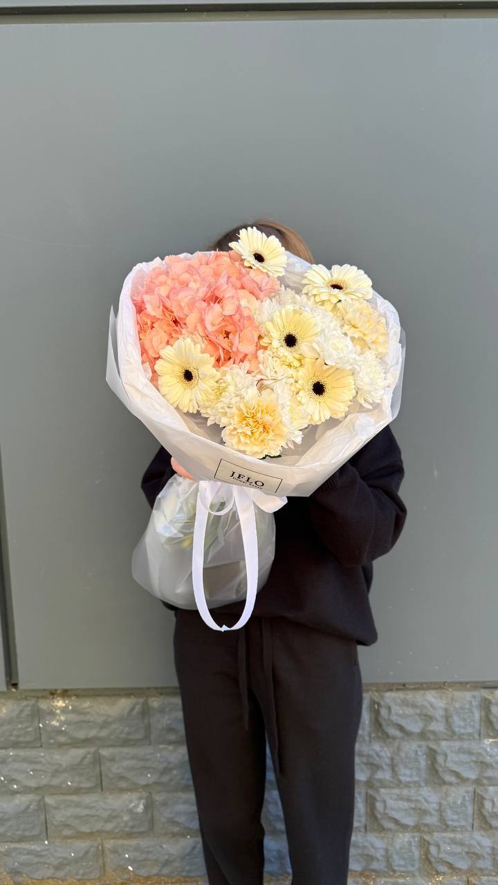 Пышные шапки гортензии создают объёмную основу, сквозь которую проступают розы и герберы. Букет плотно собран, каждый цветок находит своё место в общей структуре. Эвкалипт добавляет воздушности по краям композиции.