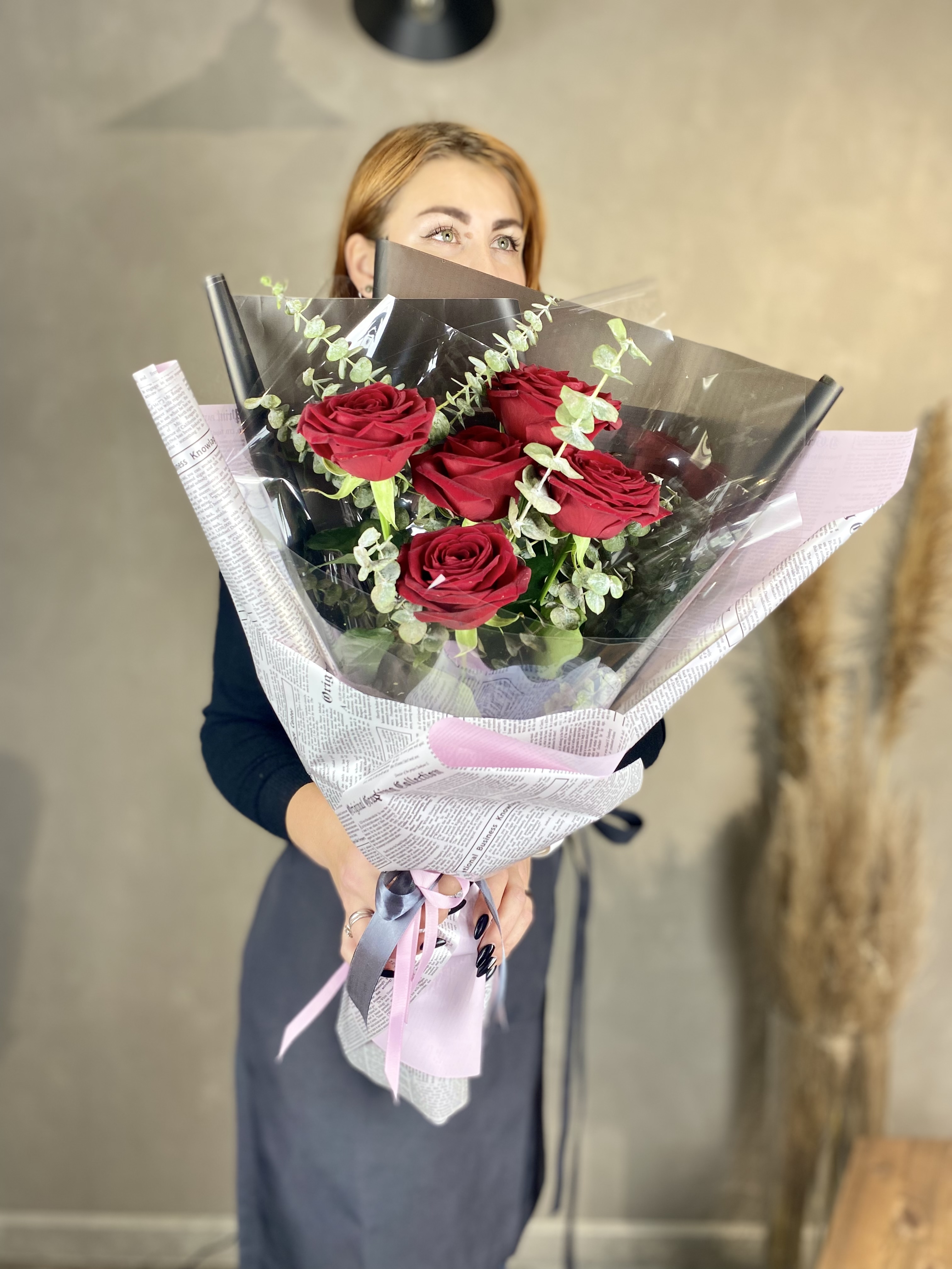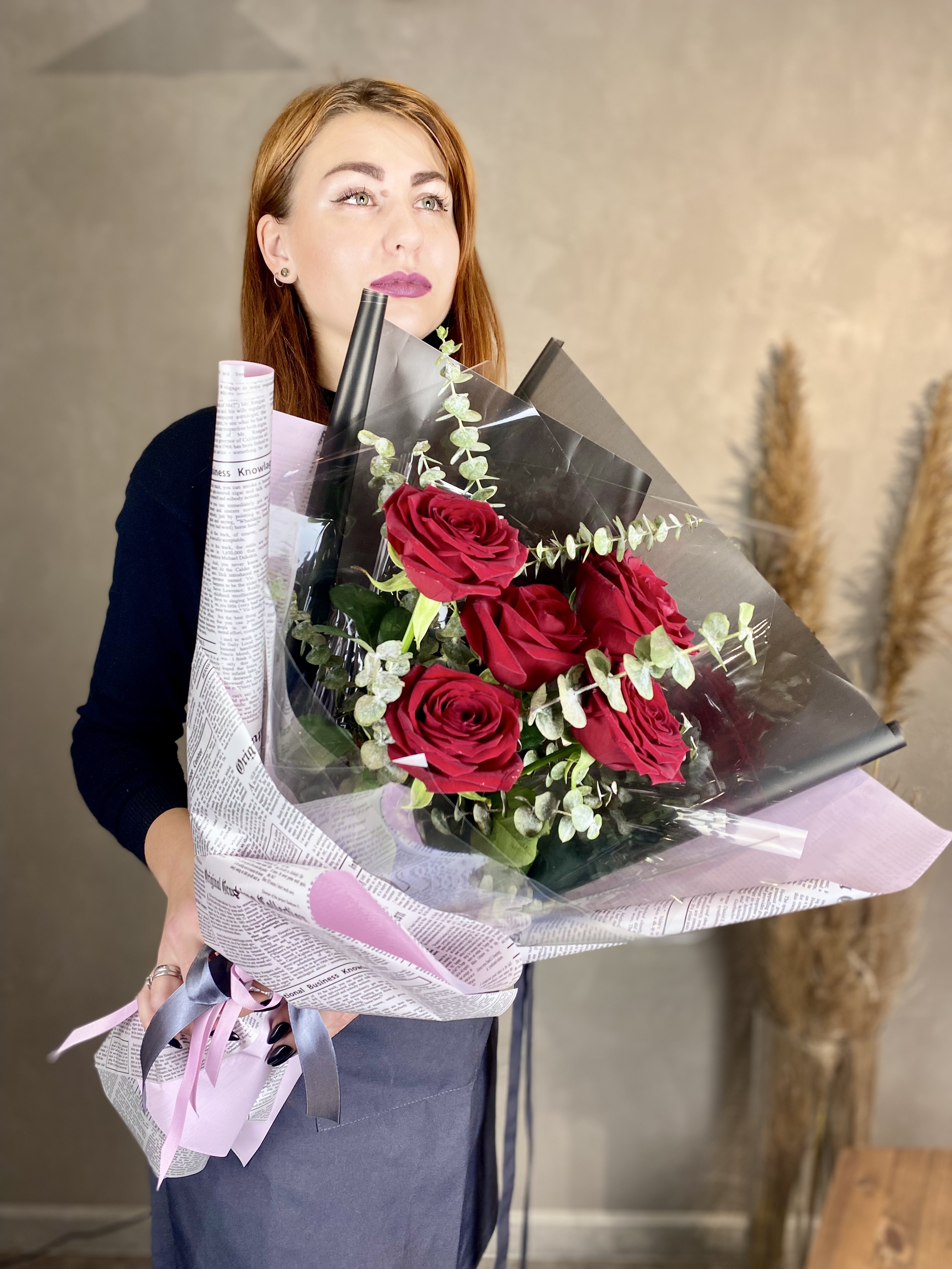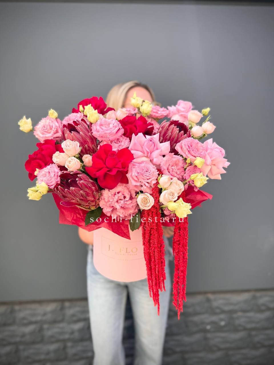 Протея с её графичными соцветиями задаёт ритм всей композиции. Амарант свисает мягкими нитями, эустома добавляет воздуха, а кустовые розы собирают форму в плотный цилиндр.