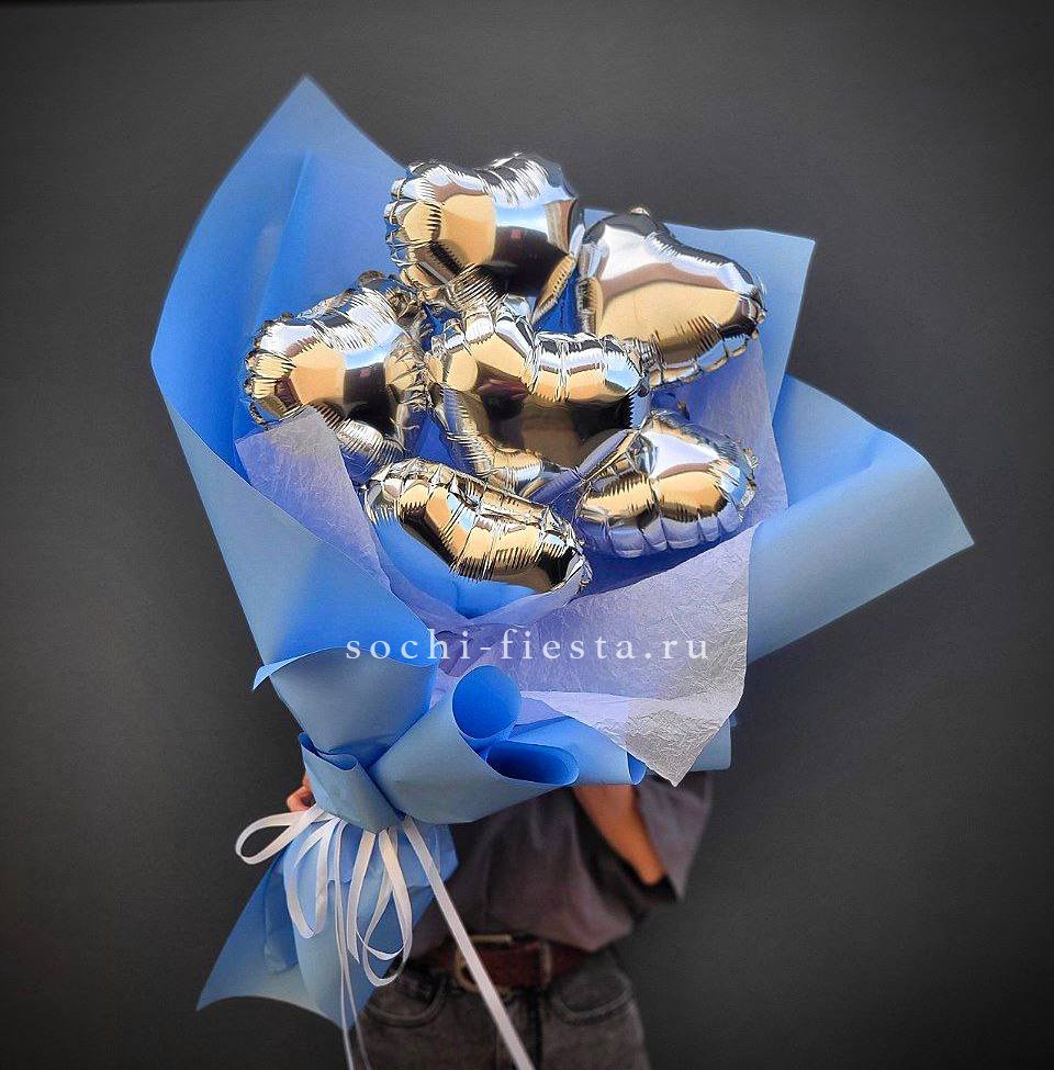 6 шариков на ножках, оформление. Цвет шариков и форма согласовывается с покупателем из наличия. Шарики надуваются воздухом, не гелием! Размер композиции: 50х70см, размер одного шара 25см.