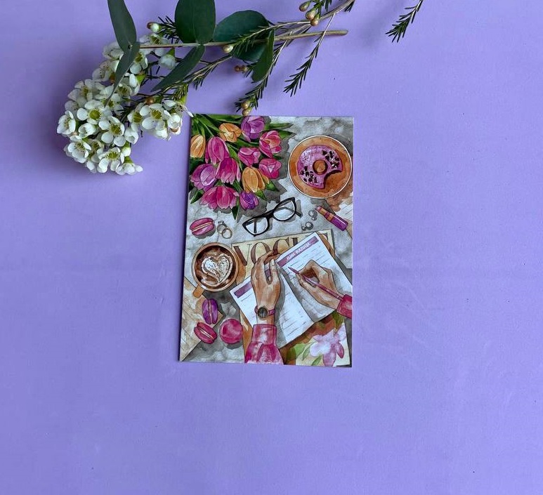 Дизайнерская открытка с авторской иллюстрацией в стиле современной графики. Место для персонального послания позволяет добавить личные слова и превратить композицию в полноценное высказывание.