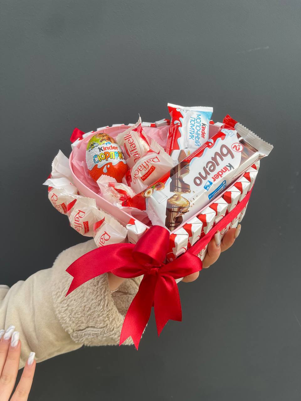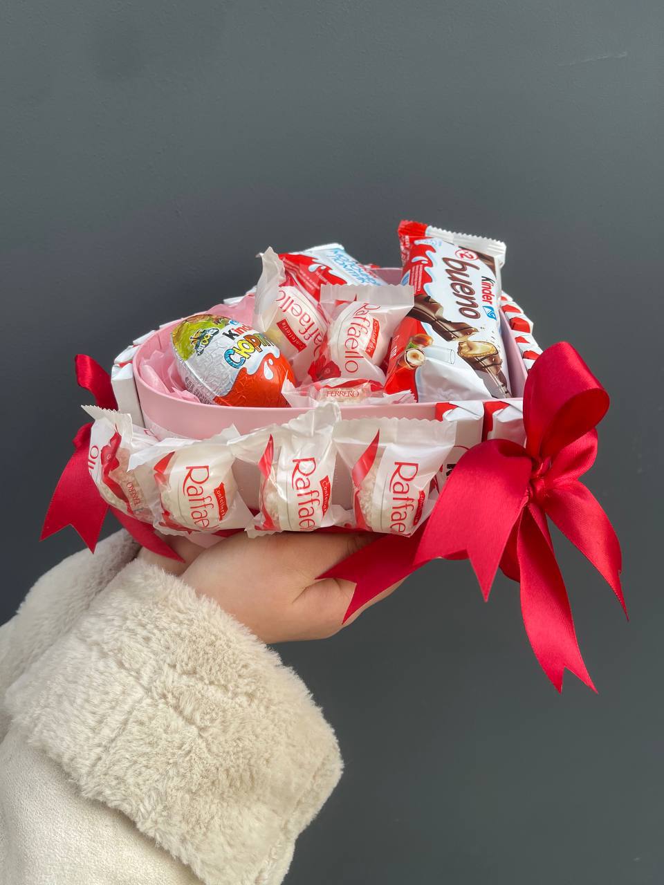 яйцо Kinder- 1шт., Kinder шоколад- 4уп., Kinder Bueno- 1шт., молочный ломтик-1шт., Raffaello-3шт., наполнитель, цилиндрическая коробка.
