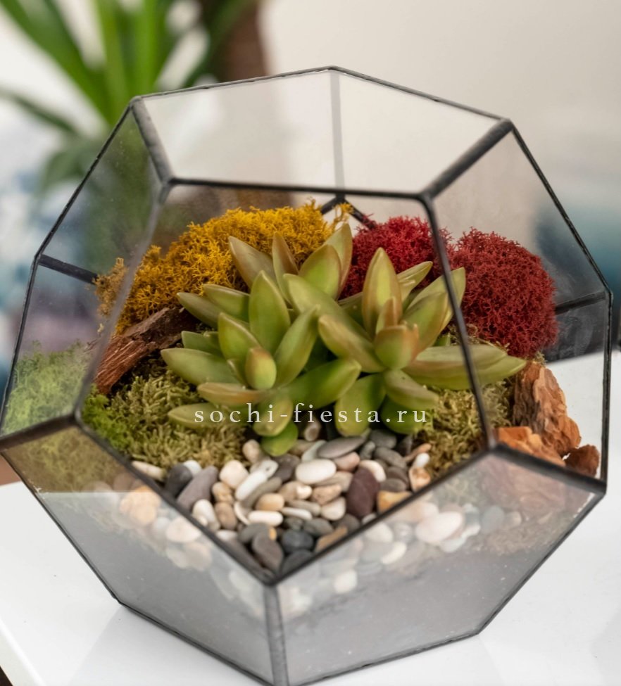 флорариум в кашпо Додекаэдр идеален для подарка искушенным и практичным личностям. Растение неприхотливо в уходе, композиция стильно смотрится в любом пространстве:)