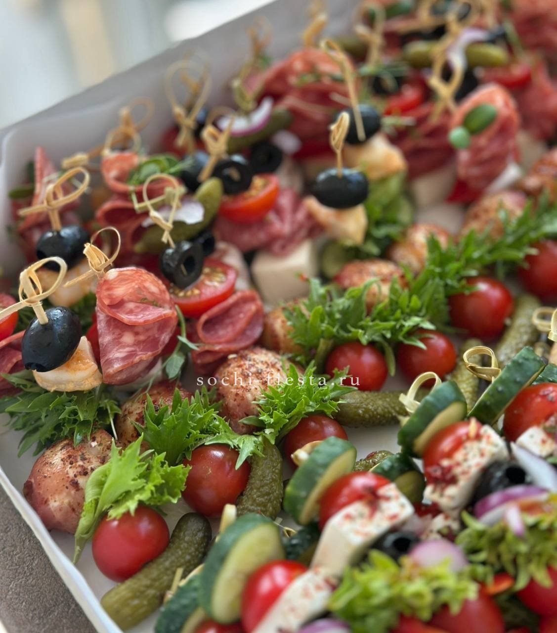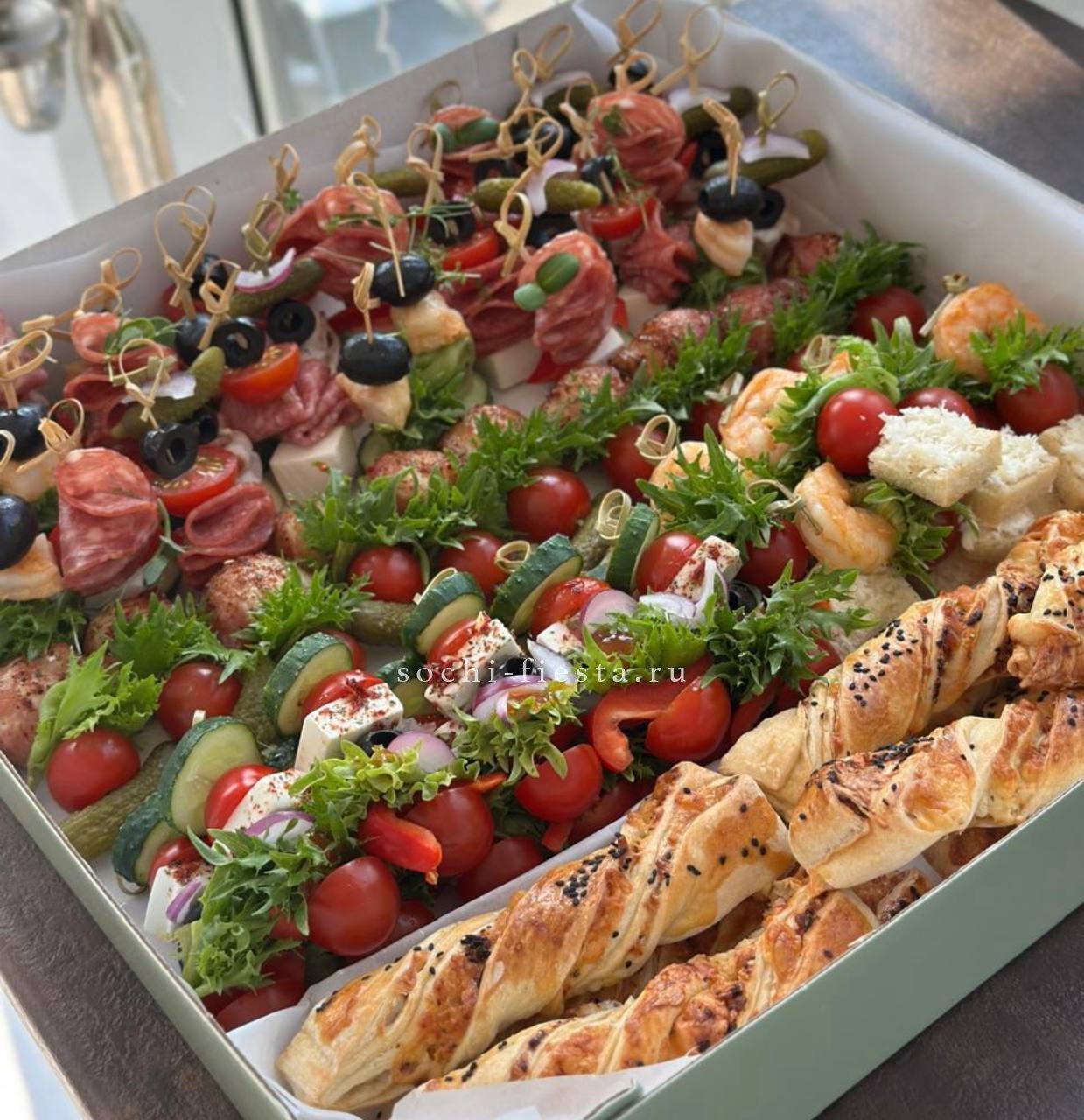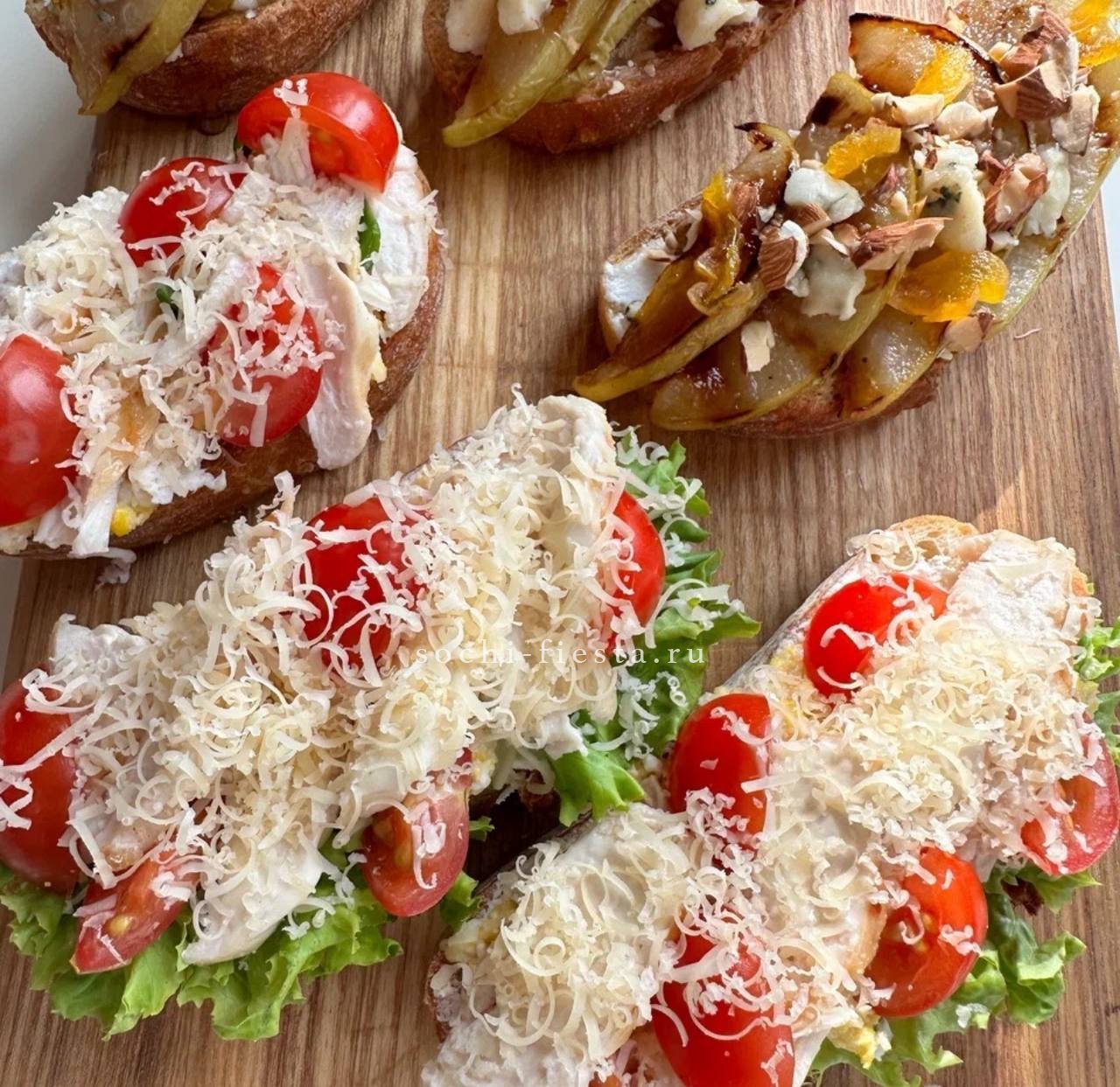 брускетта с голубым сыром и карамелизированной грушей- 3 шт.,  брускетта Цезарь- 3 шт., брускетта сырная с манго-маракуйя- 3 шт.