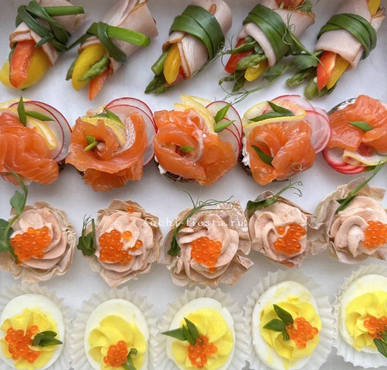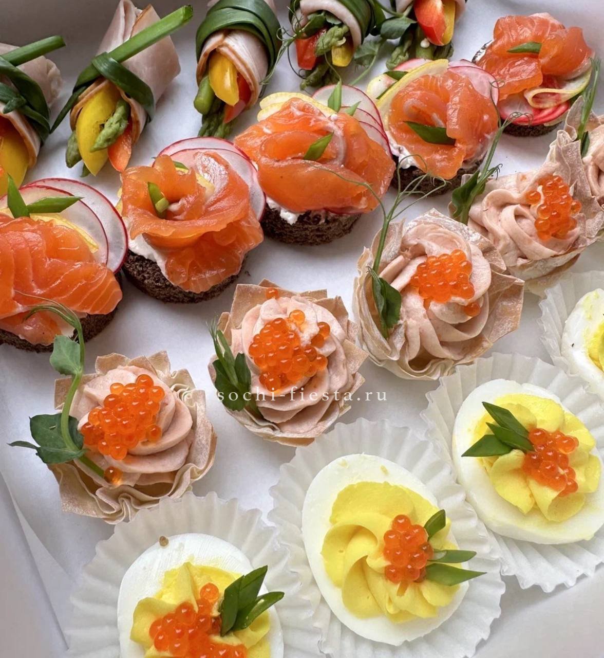с говядиной и вялеными помидорами- 4 шт. С нежным сливочным паштетом из куриной печени- 4 шт.С семгой и огурцом на крем чиз- 4 шт. С карбонадом, черри и салатом- 4 шт.