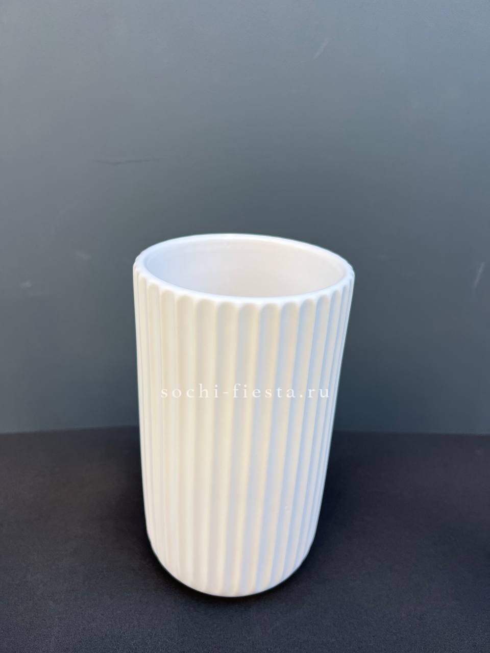 Белая керамическая ваза с лаконичными пропорциями и матовой поверхностью. Вместительная форма позволяет создавать крупные композиции из живых или сушеных растений.