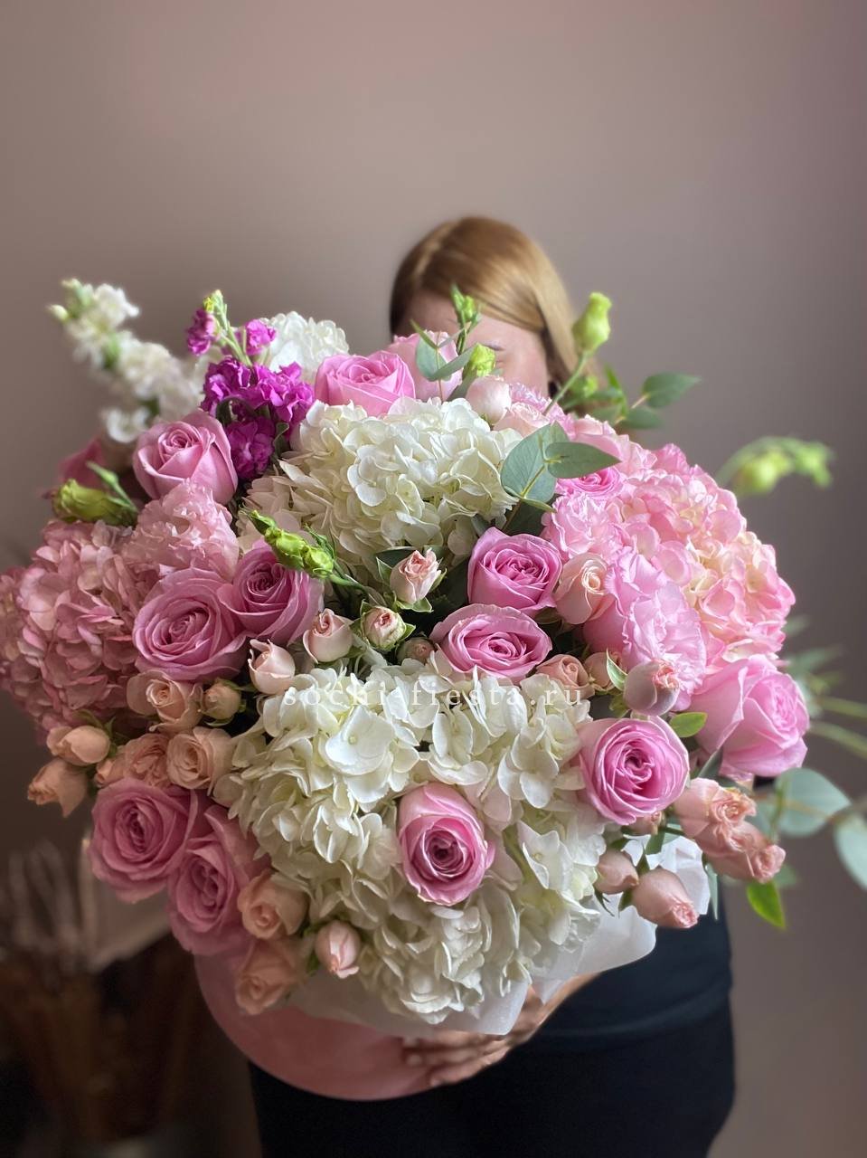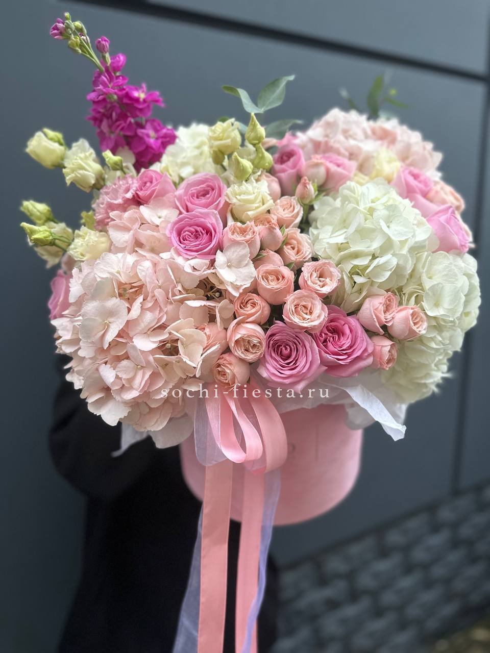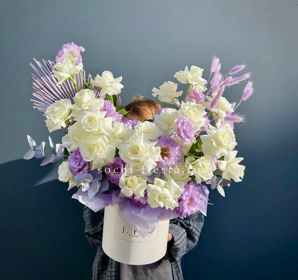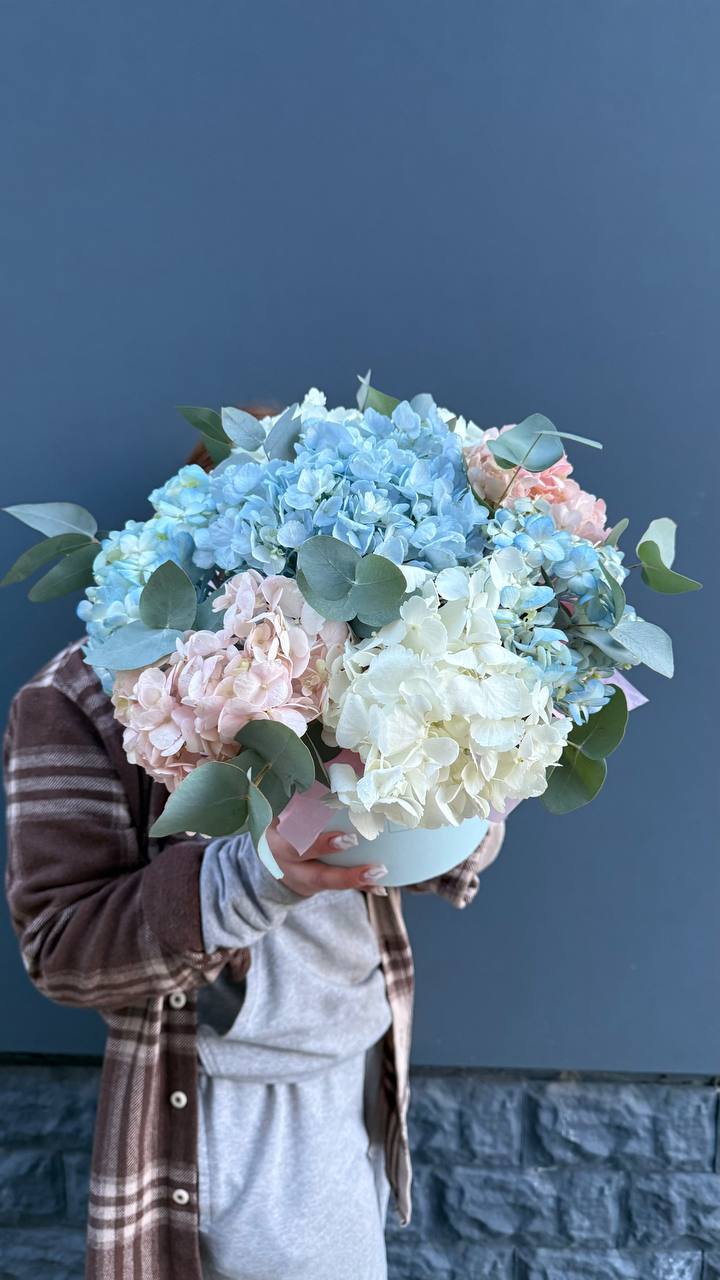 гортензия, вывернутые розы, диантус, кустовая роза, эустома, бокс D20, тишью.