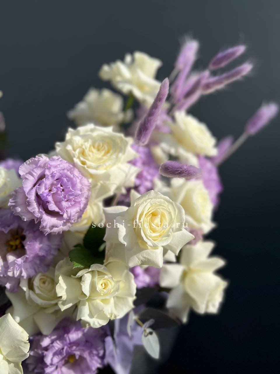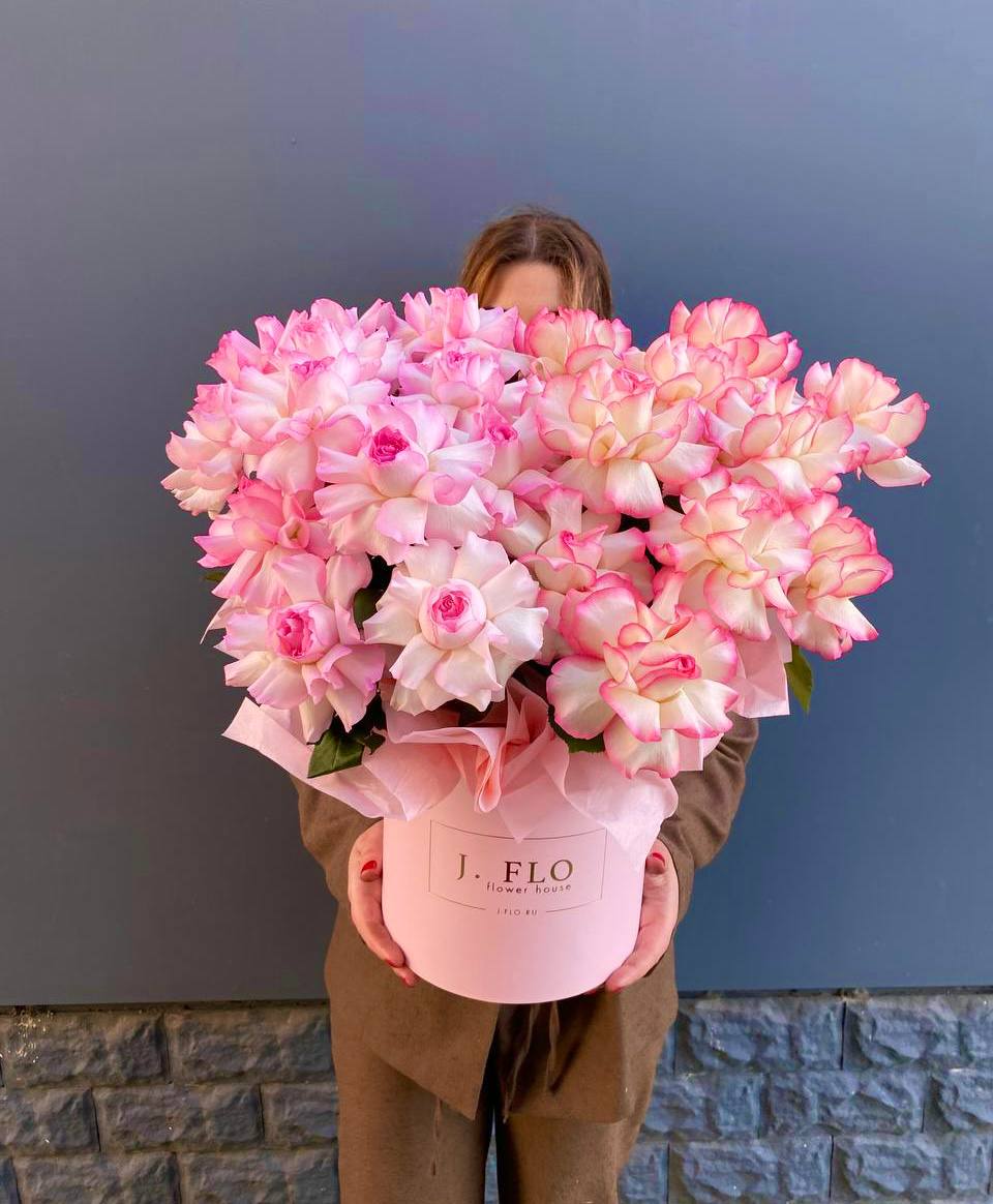Вывернутые лепестки роз открывают внутреннюю текстуру бутонов и добавляют объема композиции. Гортензия и эустома заполняют пространство между крупными головками и создают многослойность.