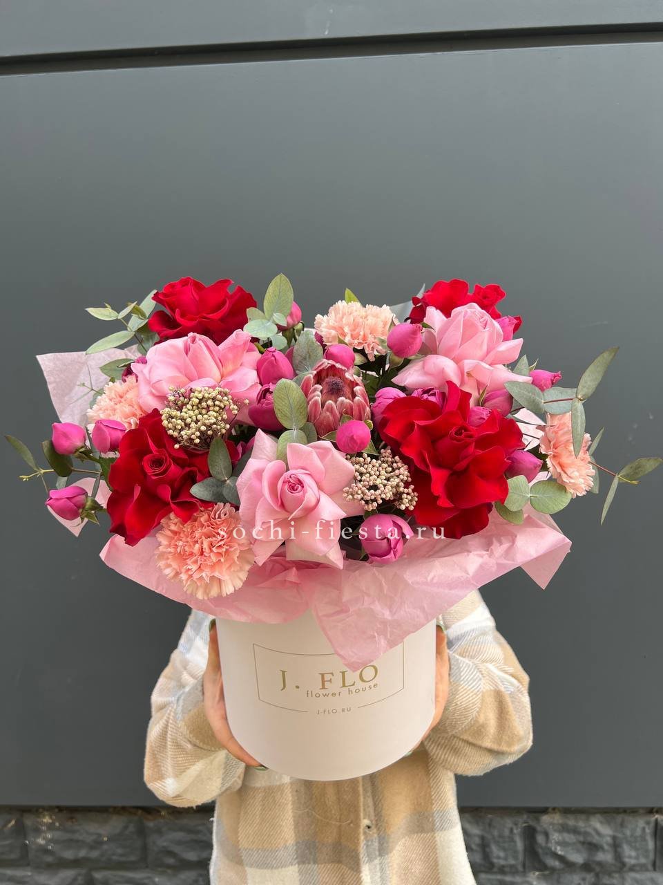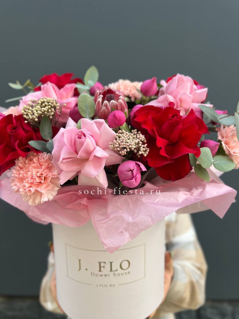 Протея задаёт графику всей композиции, а розы и диантусы заполняют объём плавными переходами оттенков. Мисти баблс добавляет воздушности, озотамнус создаёт текстурные акценты между крупными бутонами.