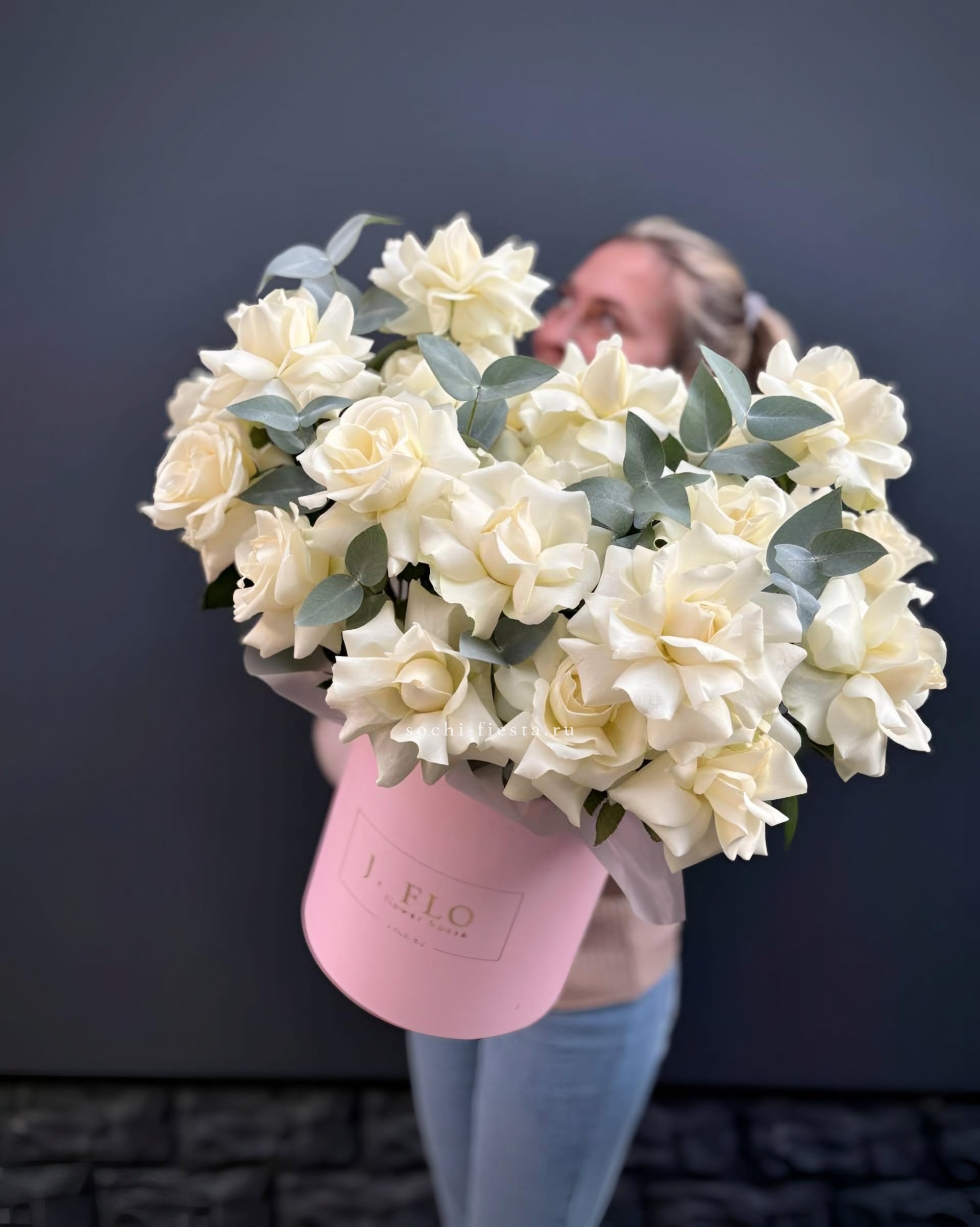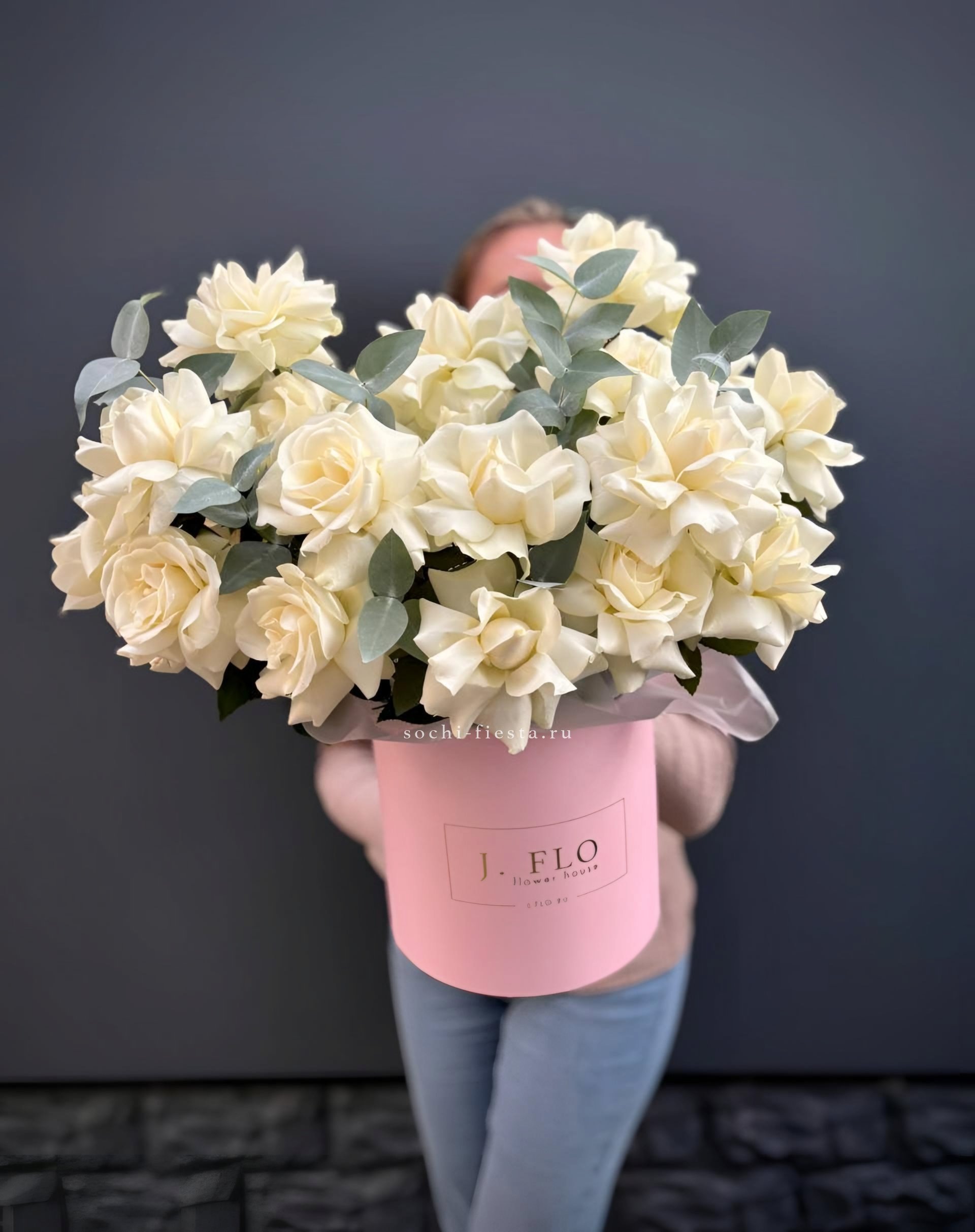 25 белых роз на фото, цилиндр D20.